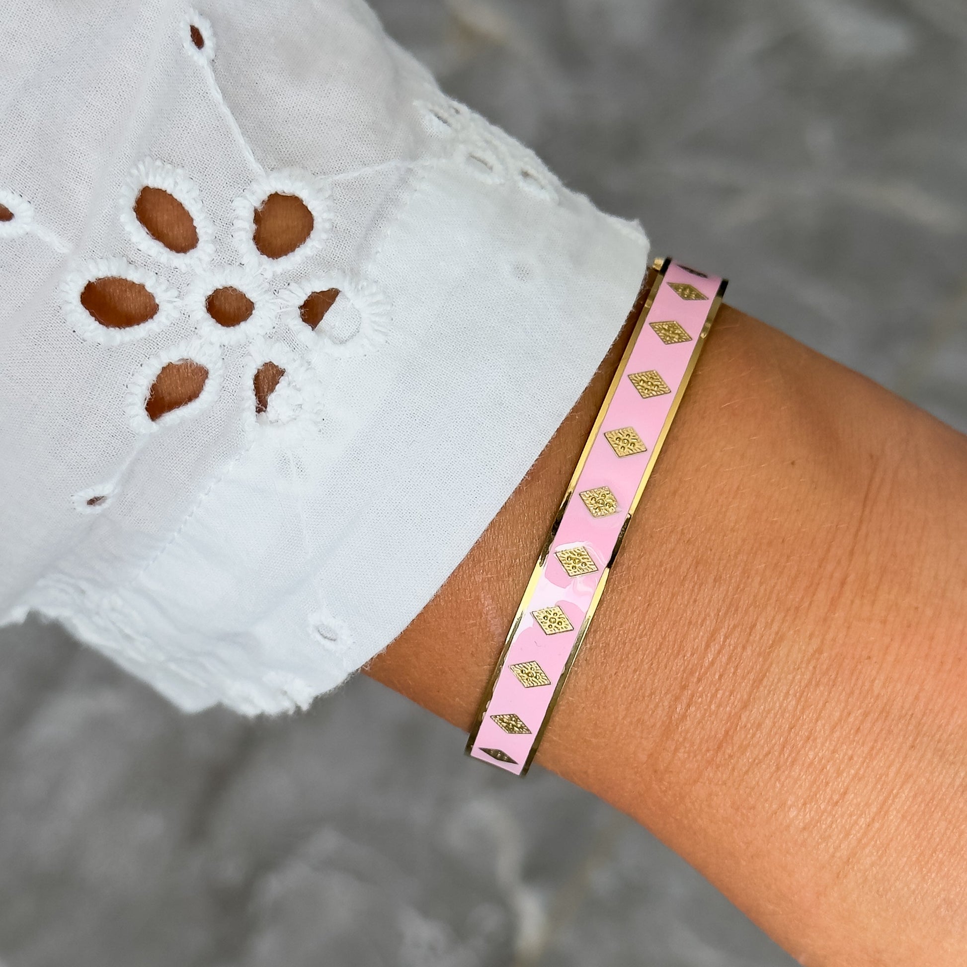 Un bracelet jonc moderne et raffiné, sublimé par des motifs géométriques dorés. À porter seul, en accumulation ou en mélange pour un style unique.