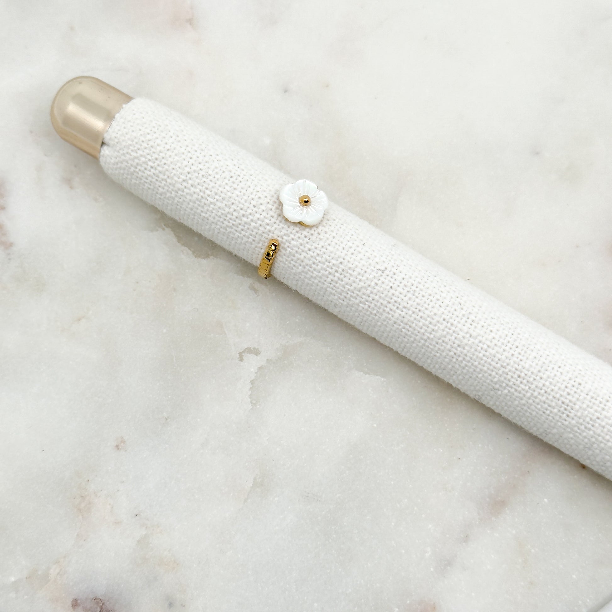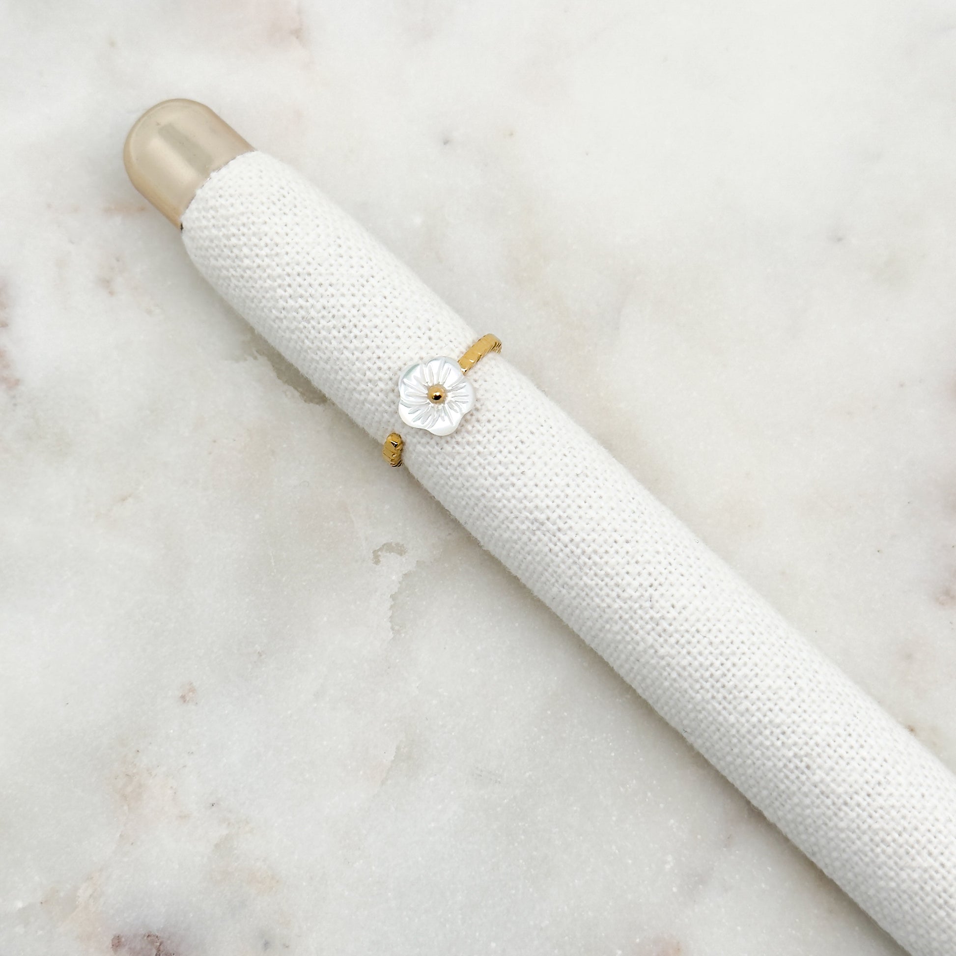 La bague Flavia séduit par sa fleur blanche au fini nacré, délicatement posée sur un anneau ouvert doré. Un bijou raffiné et féminin, facile à porter au quotidien.
