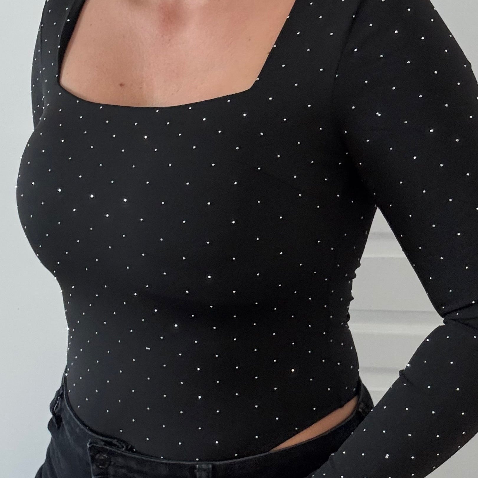 Mets en avant ta silhouette avec ce body noir échancré orné de strass. Sa matière épaisse et ses coques intégrées offrent un maintien impeccable. Porté avec un jean taille haute, il reste discret ; avec une taille basse, l’échancrure apporte un style assumé. Une pièce tendance, chic et brillante.