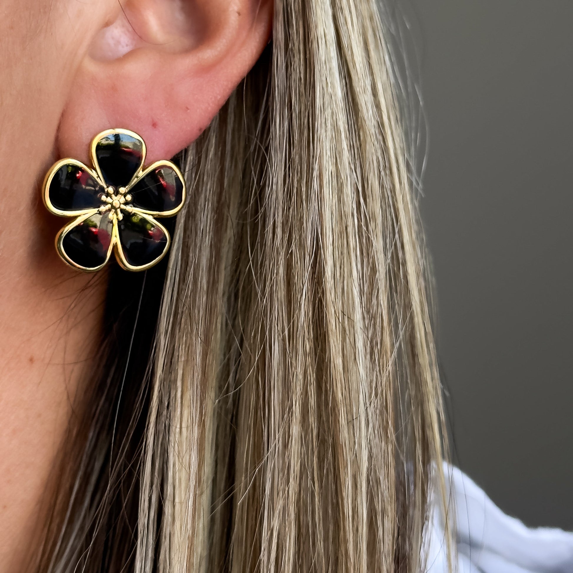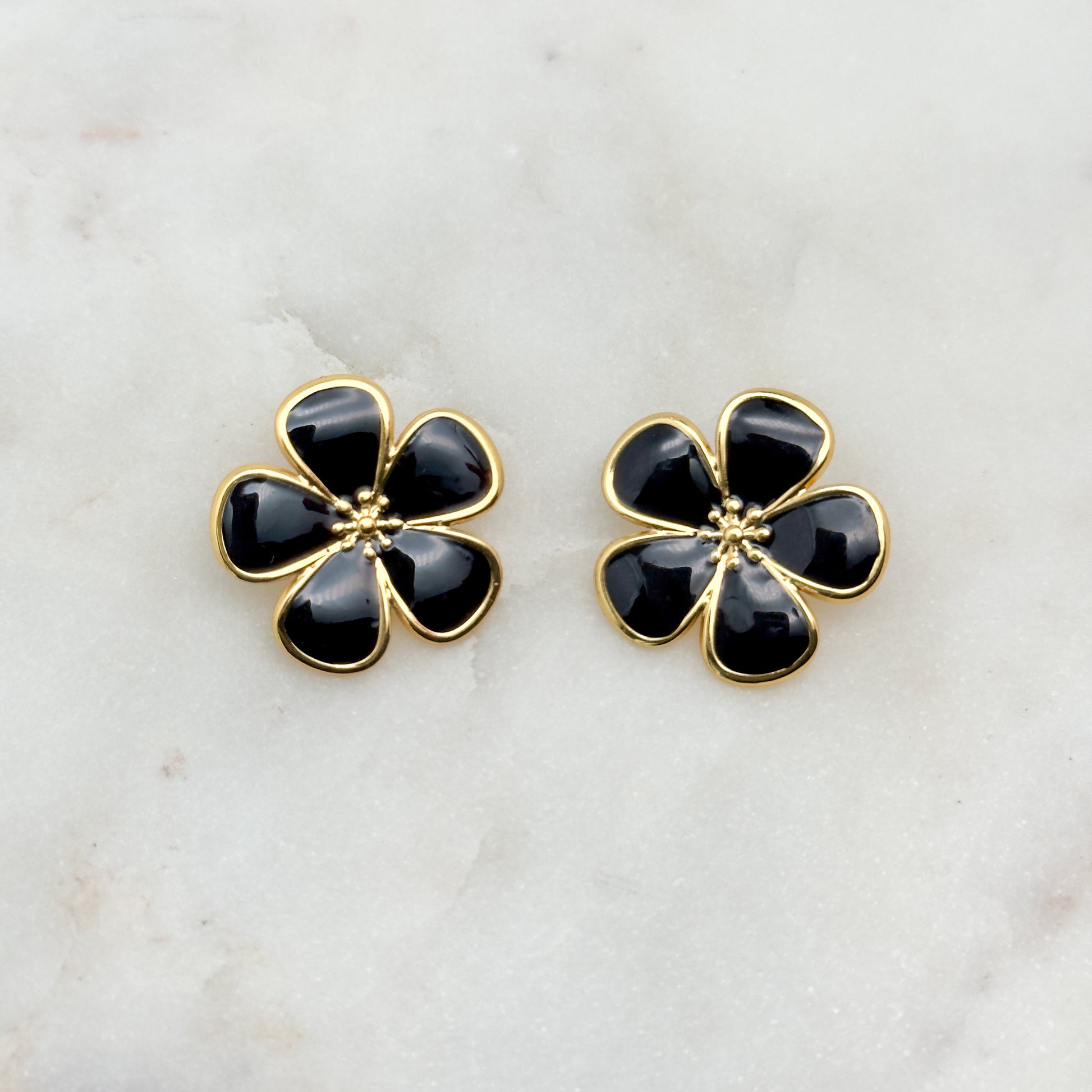 Apportez une touche florale et colorée à vos tenues avec ces boucles d’oreilles en forme de fleur dorée émaillée noir. Conçues en acier inoxydable, elles résistent à l’eau, ne ternissent pas et sont hypoallergéniques. Un bijou raffiné qui allie modernité et féminité, idéal pour toutes les occasions.