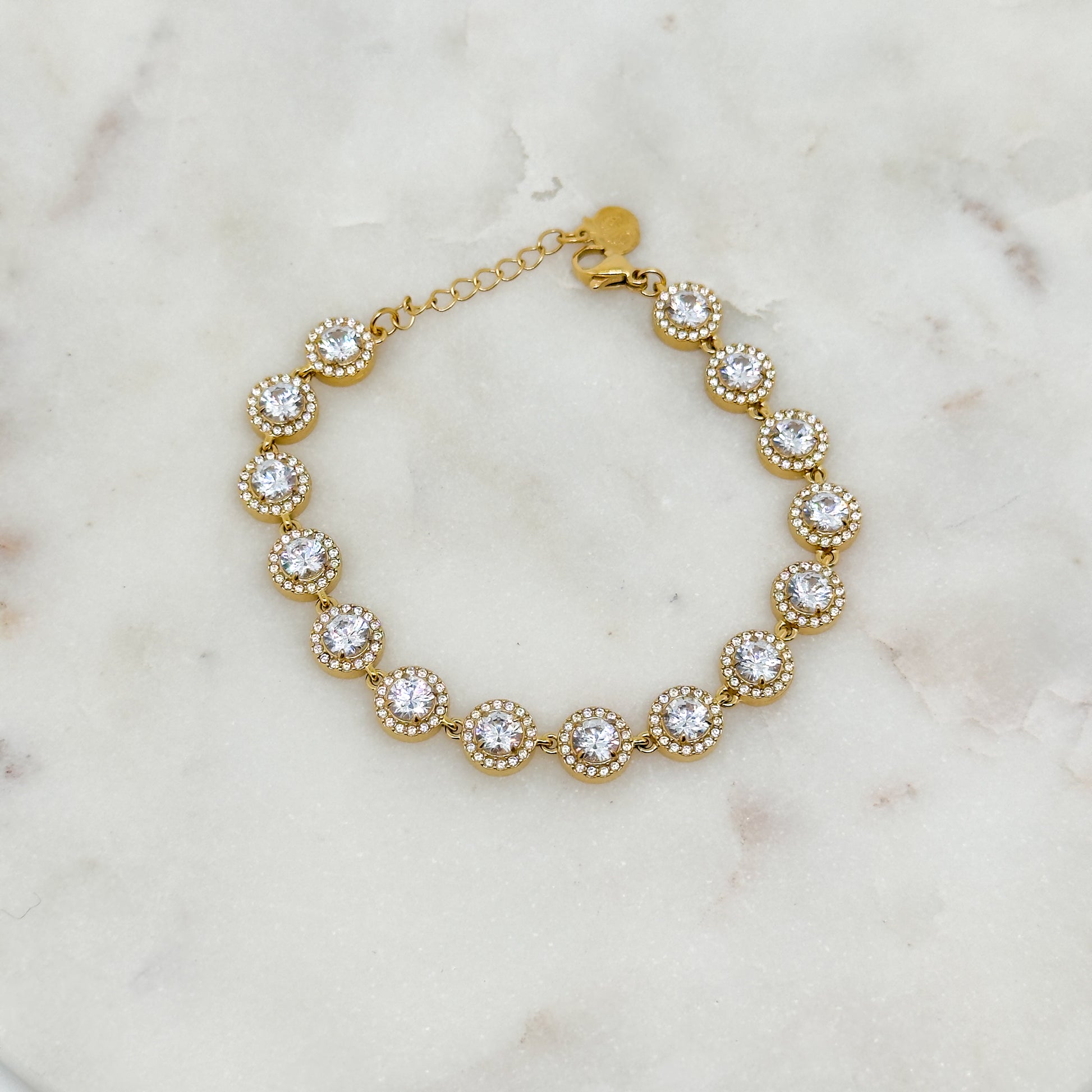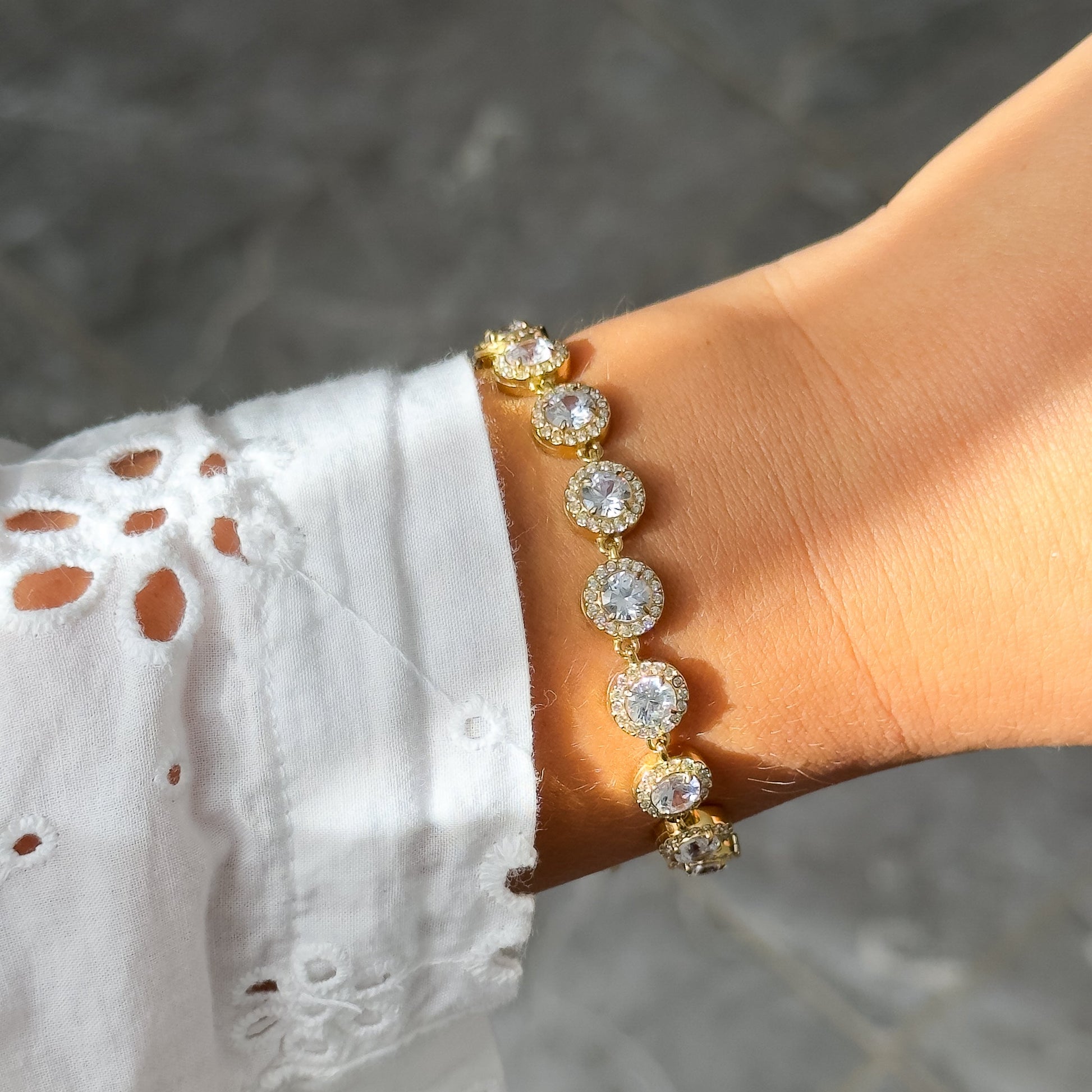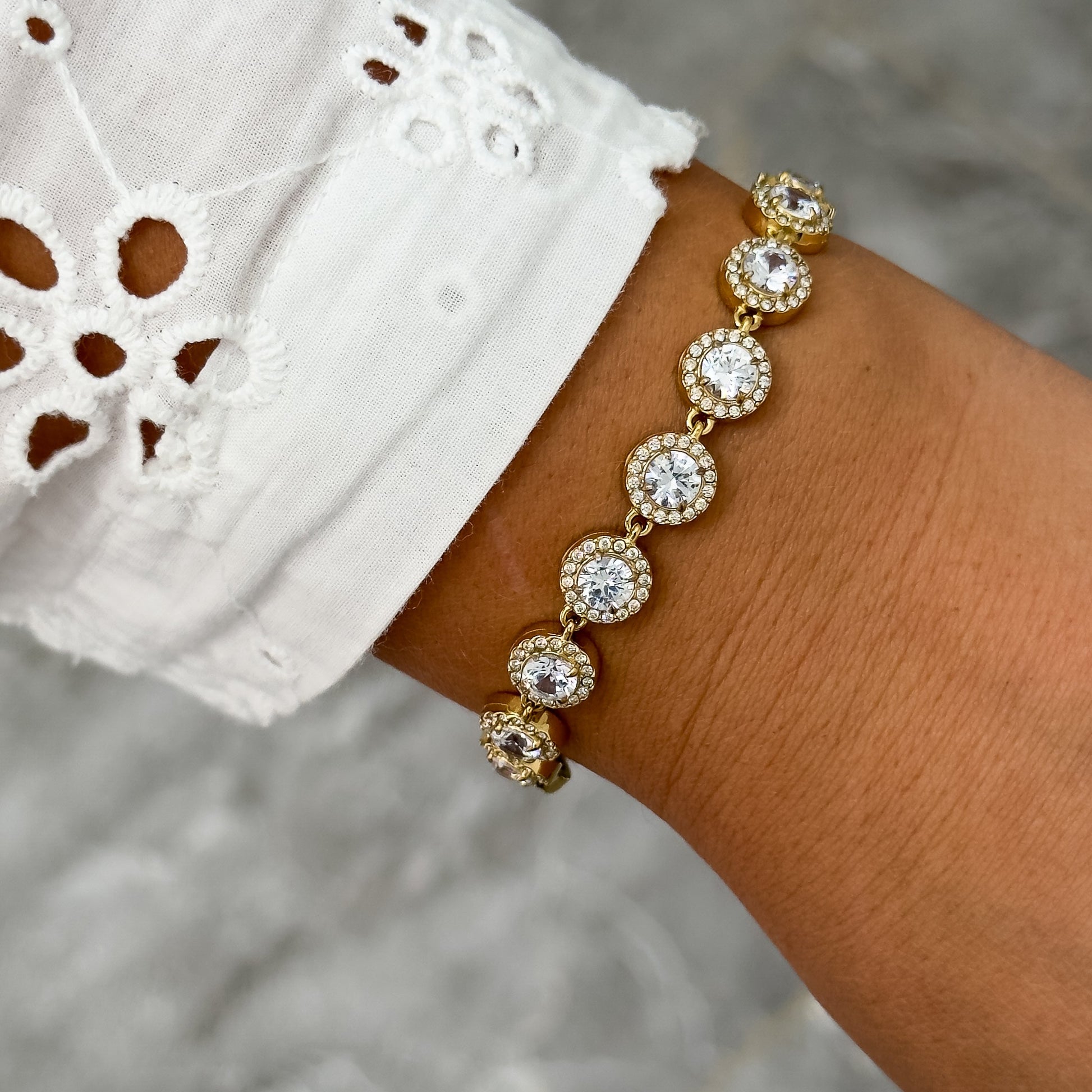 Le bracelet Auriane se distingue par son éclat raffiné et son design intemporel. Chaque strass rond, mis en valeur par un serti doré délicat, capte la lumière avec intensité et apporte une touche précieuse au poignet.