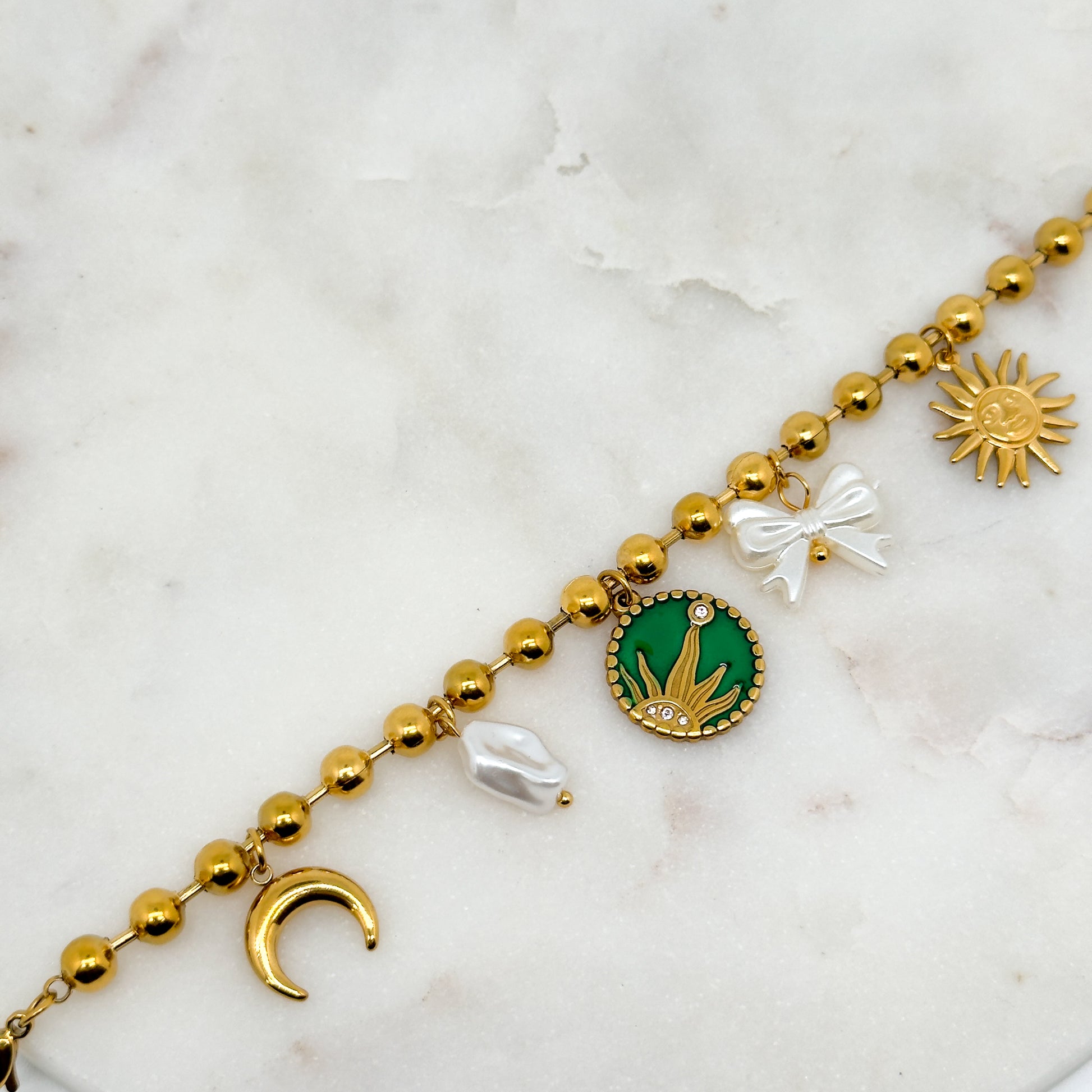 Le bracelet Brune est un bijou unique qui marie élégance et symbolisme. Sa chaîne dorée à maillons boules est sublimée par cinq pendentifs délicats : une lune dorée, une perle irrégulière blanche, un médaillon vert orné d’un motif doré, un petit nœud blanc et un soleil rayonnant.