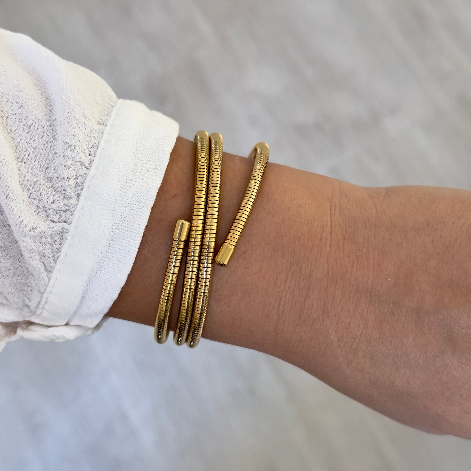 Ce bracelet se distingue par son design entrelacé au fini doré éclatant. Son allure sculpturale et fluide apporte une touche de caractère à toutes les tenues. Conçu en acier inoxydable, il combine résistance et élégance, tout en restant confortable au poignet grâce à sa forme souple et ajustable.