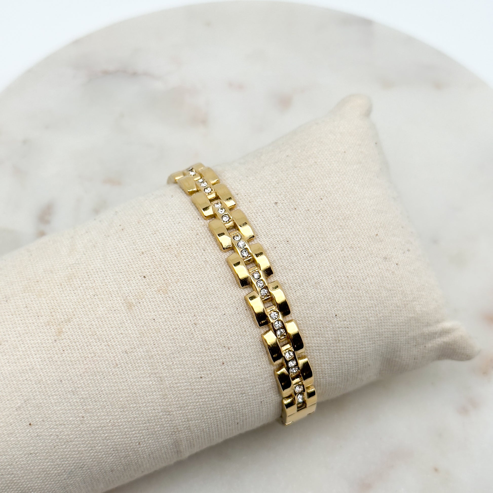Le bracelet Isaline allie élégance moderne et inspiration horlogère. Son design rigide reprend l’esprit des maillons de montre, revisité dans une version féminine et délicate. Une ligne centrale de strass étincelants vient illuminer le bijou, captant la lumière avec subtilité.