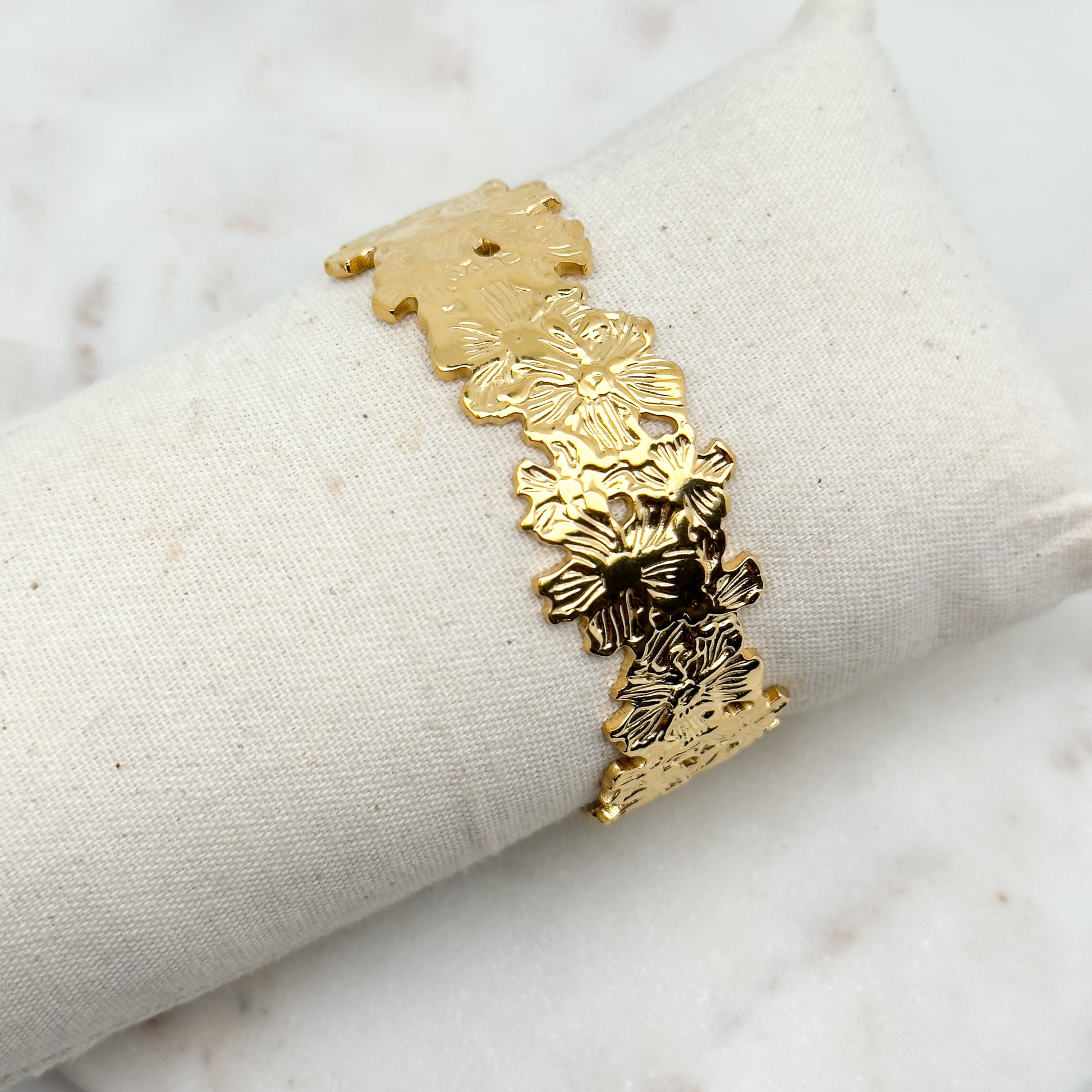 Le bracelet Alba est une pièce élégante et sophistiquée qui attire le regard par ses détails finement travaillés. Ses motifs floraux dorés apportent une touche de féminité et de modernité, idéale pour sublimer vos tenues, du quotidien aux occasions spéciales.
