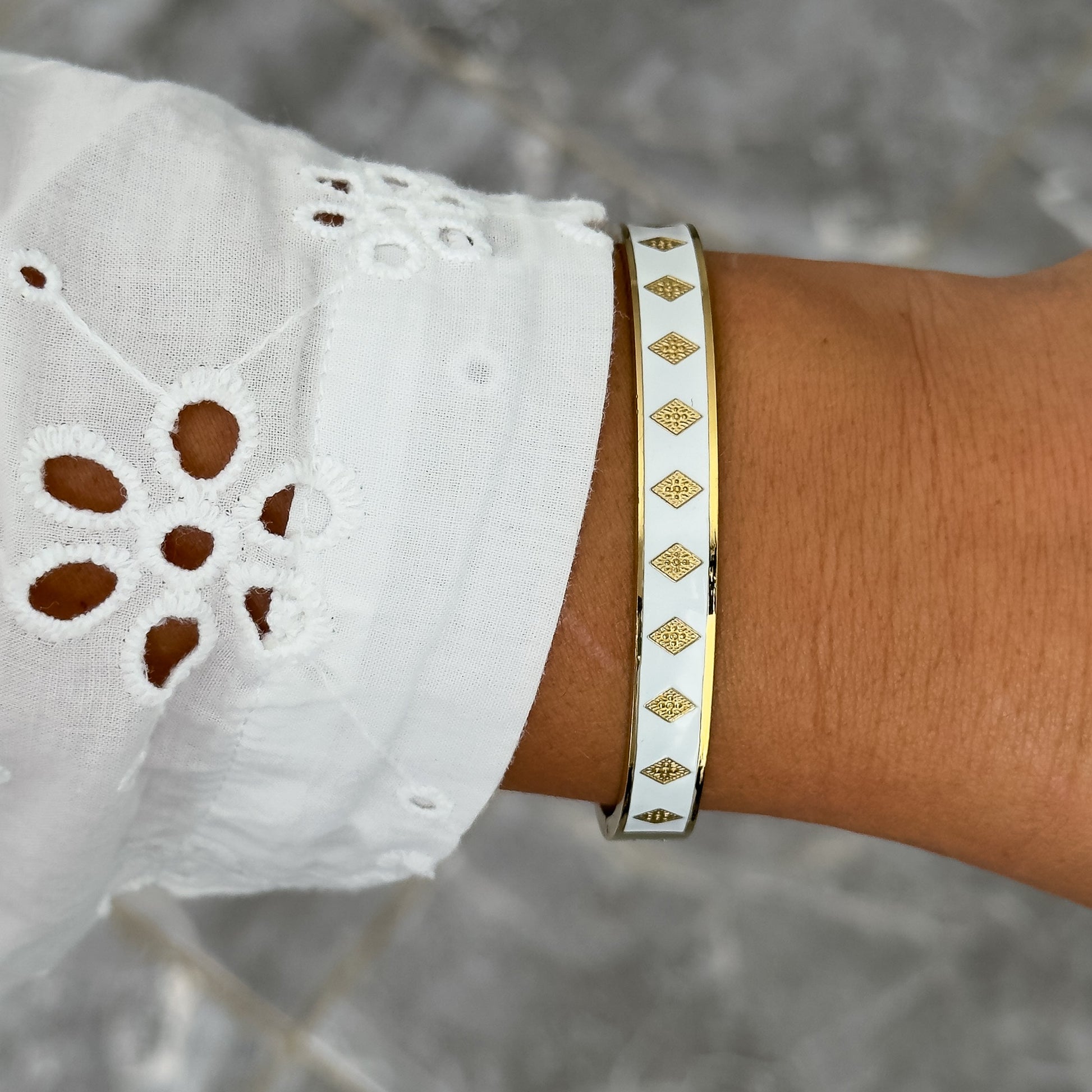 Un bracelet jonc moderne et raffiné, sublimé par des motifs géométriques dorés. À porter seul, en accumulation ou en mélange pour un style unique.