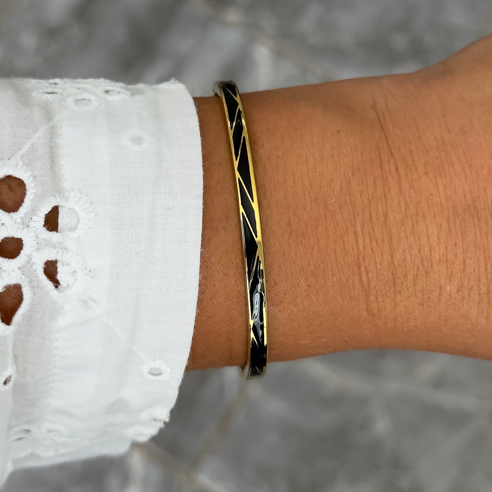 Un bracelet jonc moderne et raffiné, sublimé par des motifs géométriques dorés. À porter seul, en accumulation ou en mélange pour un style unique.