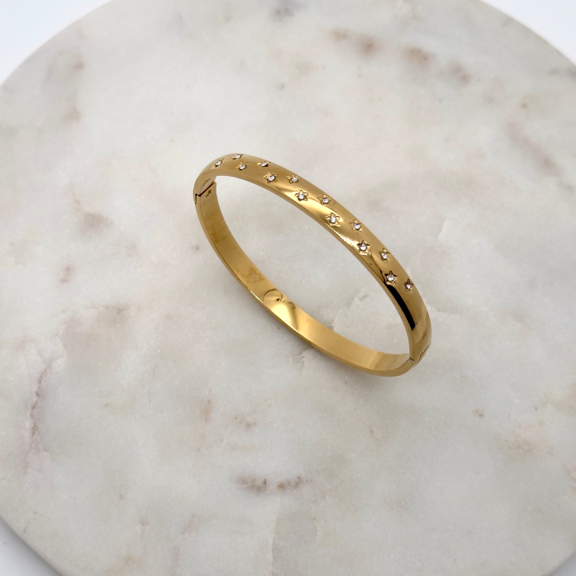 Ce jonc doré est orné de petits motifs étoilés sertis de strass scintillants, offrant un éclat délicat et raffiné. Son design élégant apporte une touche de lumière subtile au poignet. Réalisé en acier inoxydable, il est résistant à l’eau et garde sa brillance dans le temps.