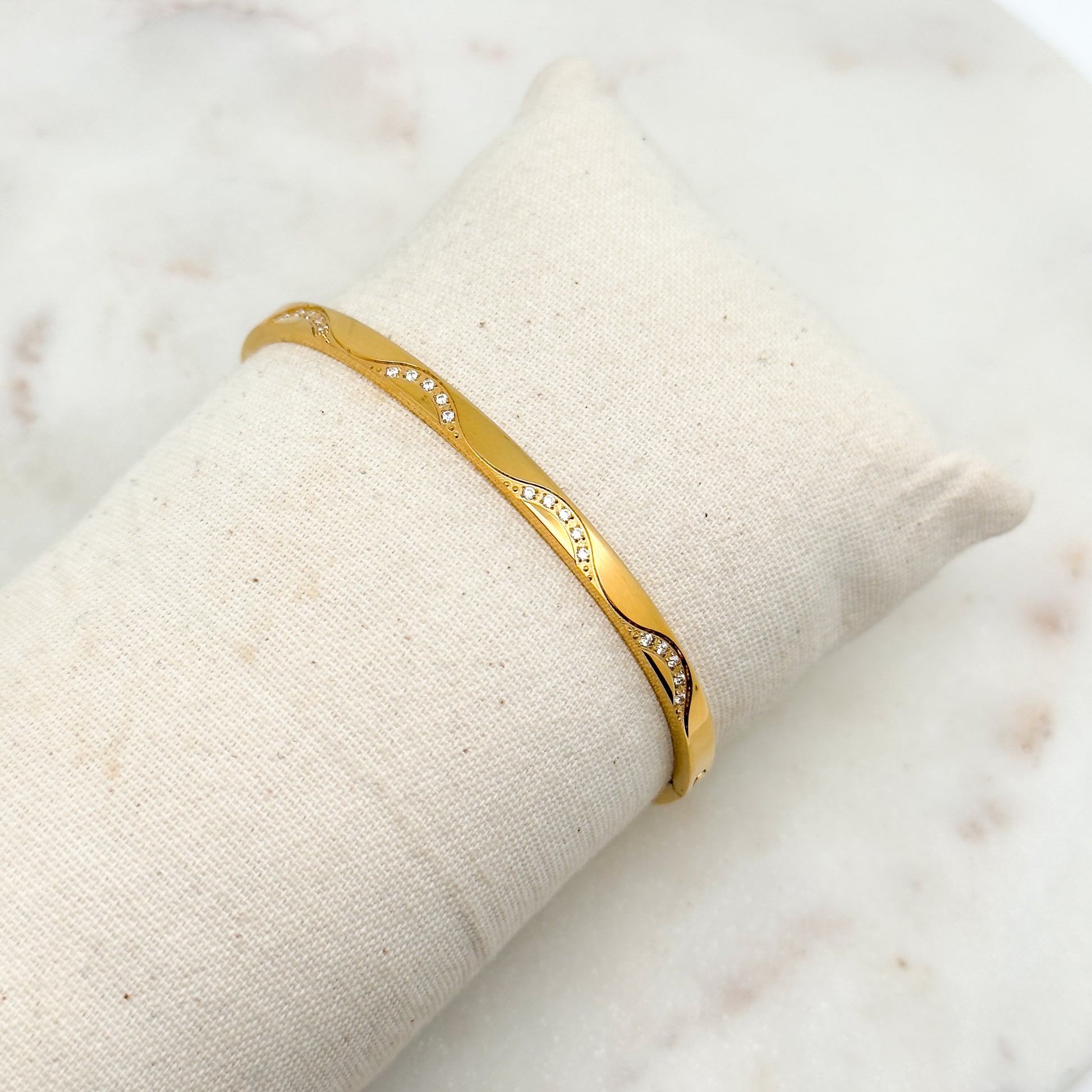 Le jonc Ondine se distingue par son design ondulé et raffiné, sublimé de strass étincelants qui captent la lumière à chaque mouvement. Son allure fluide et élégante en fait un bijou unique, à la fois moderne et intemporel.