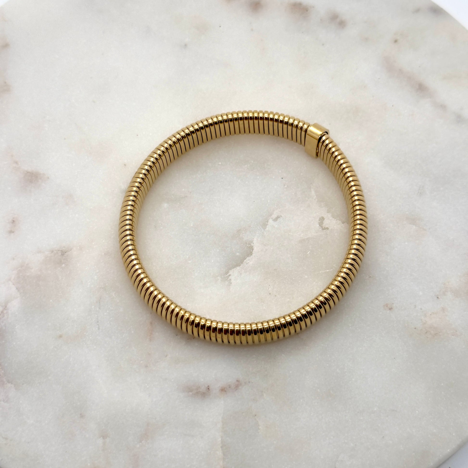 Ce bracelet se distingue par son design épuré et sa finition dorée lumineuse. Son système extensible façon accordéon assure un confort optimal et s’adapte facilement à toutes les tailles de poignet. Léger, pratique et raffiné, il apporte une touche d’éclat à toutes les tenues, du look quotidien aux occasions plus habillées.