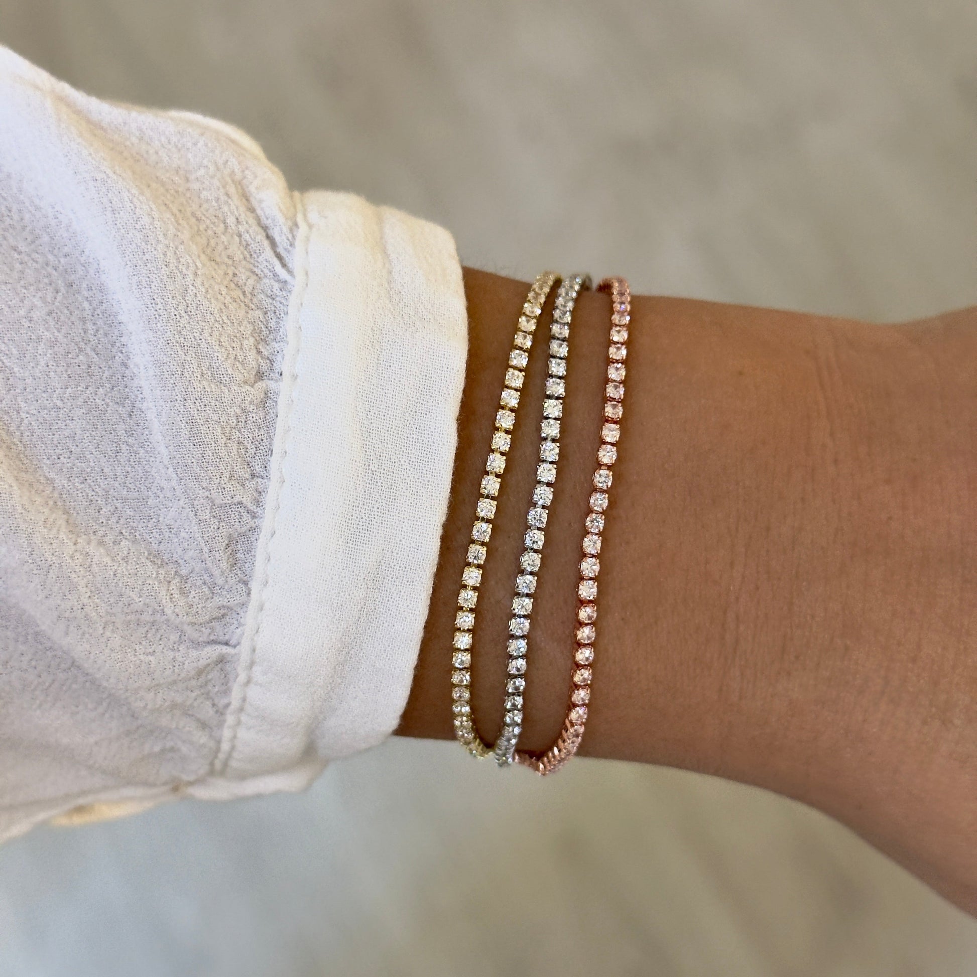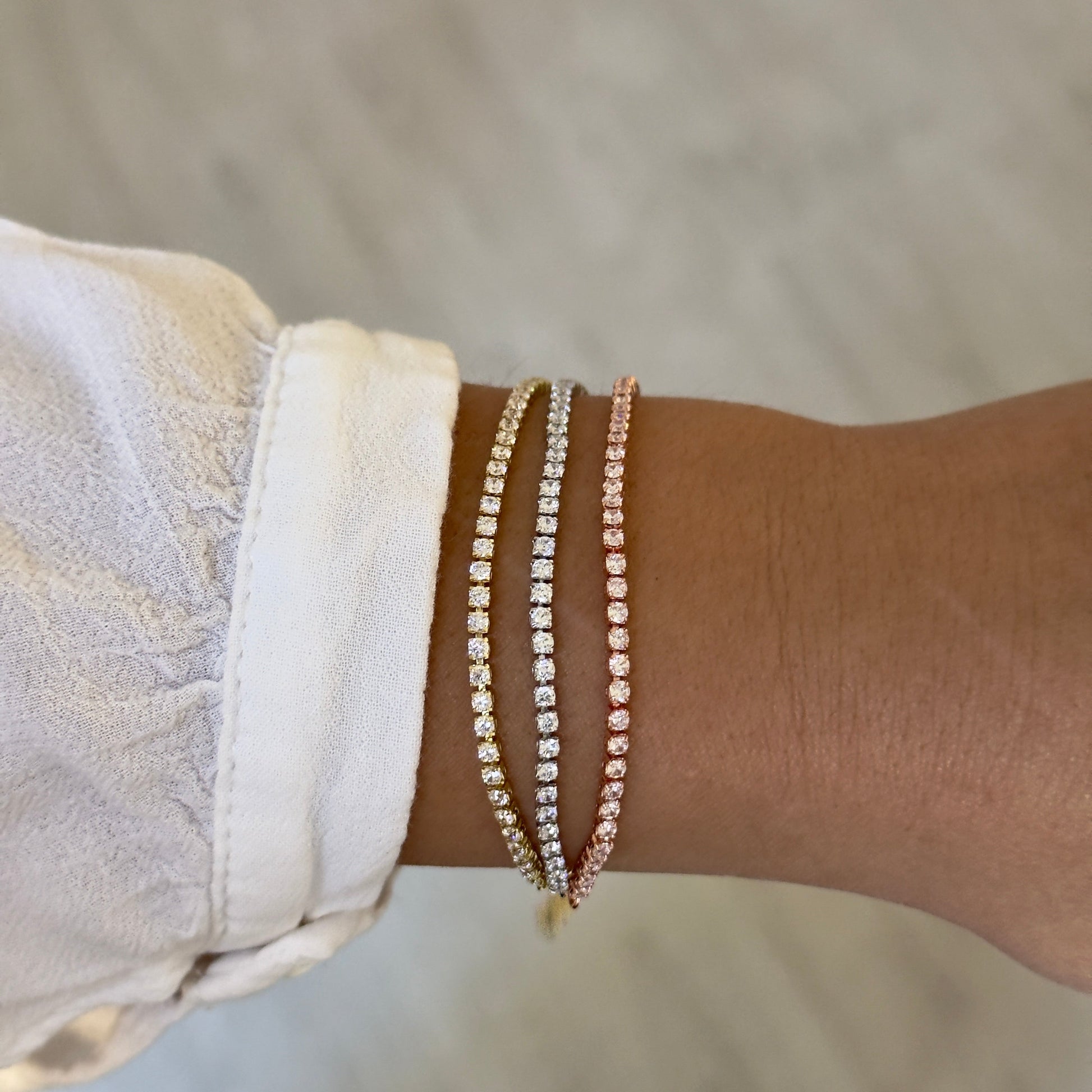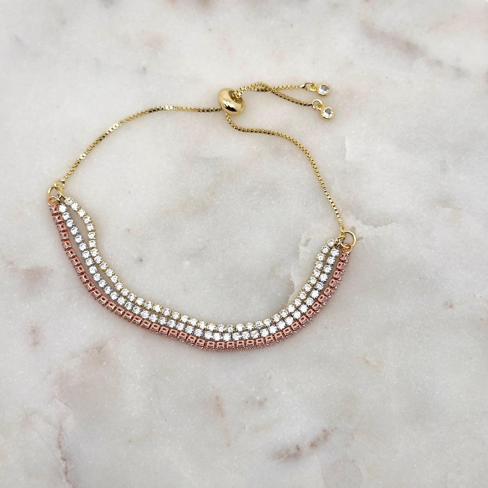 Éblouissant et raffiné, le bracelet se distingue par ses trois rangs de strass scintillants aux tons doré, argenté et rose gold. Son fermoir ajustable en acier inoxydable assure un maintien parfait et un éclat incomparable. Un bijou chic et moderne à porter en toute occasion.