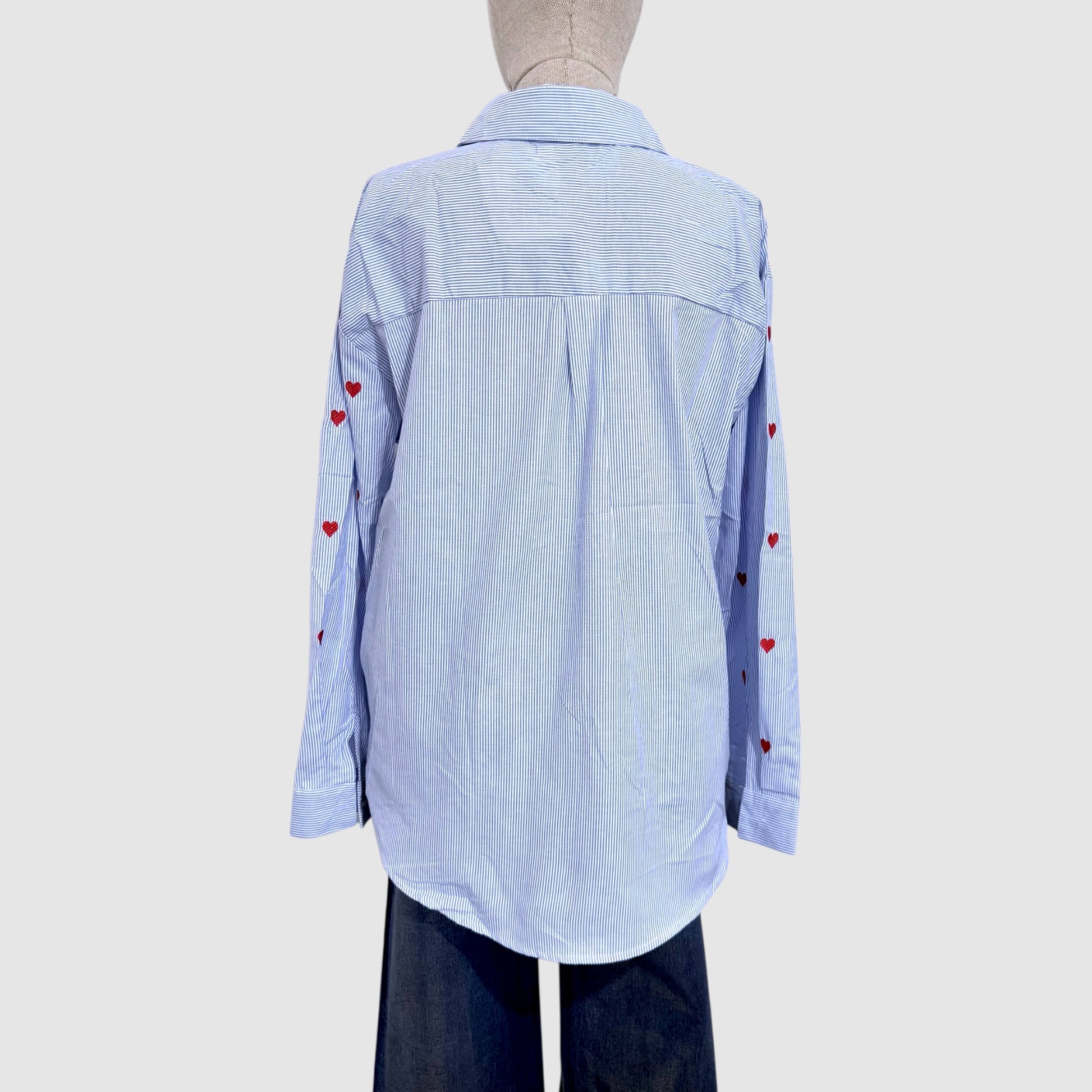 Chemise à rayures bleu ciel ou blanche rehaussée de petits cœurs brodés rouges. Coupe droite, col classique et manches longues boutonnées. Une pièce facile à porter, à la fois douce, féminine et originale, parfaite avec un jean ou un pantalon habillé.