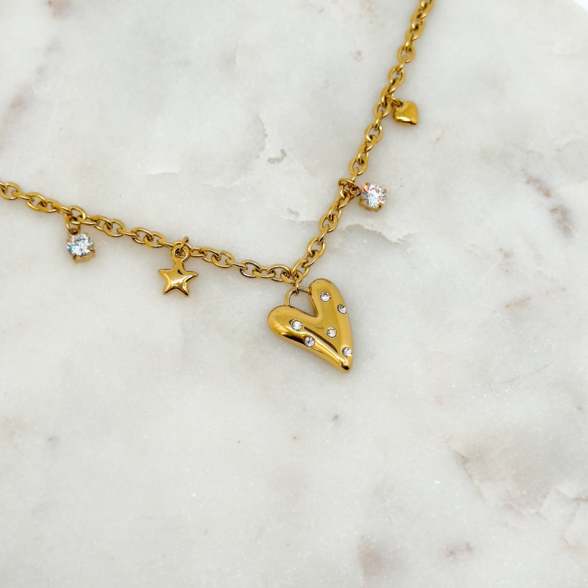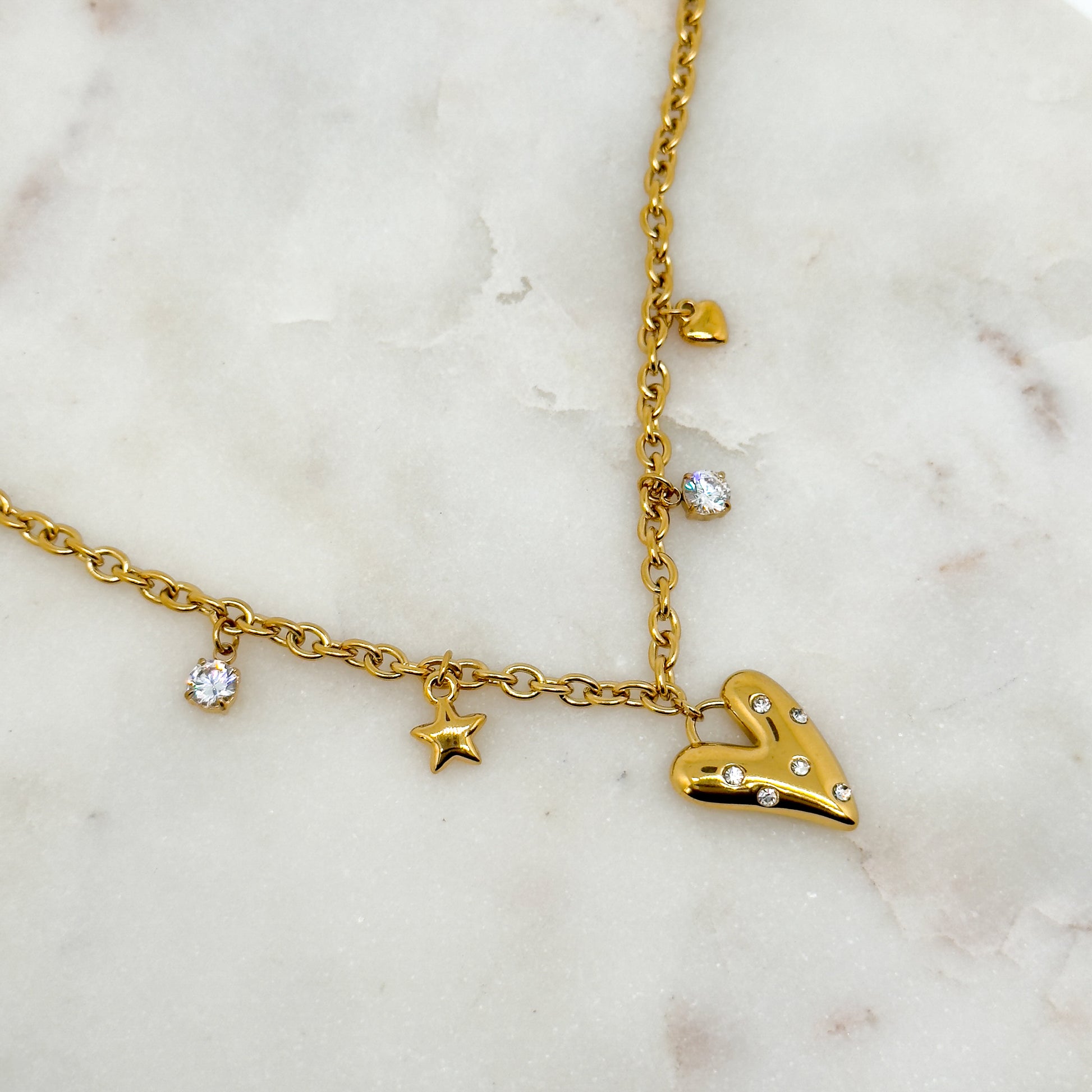 Un collier doré orné de breloques délicates – cœur, étoile et zirconiums scintillants – pour une touche à la fois romantique et lumineuse.