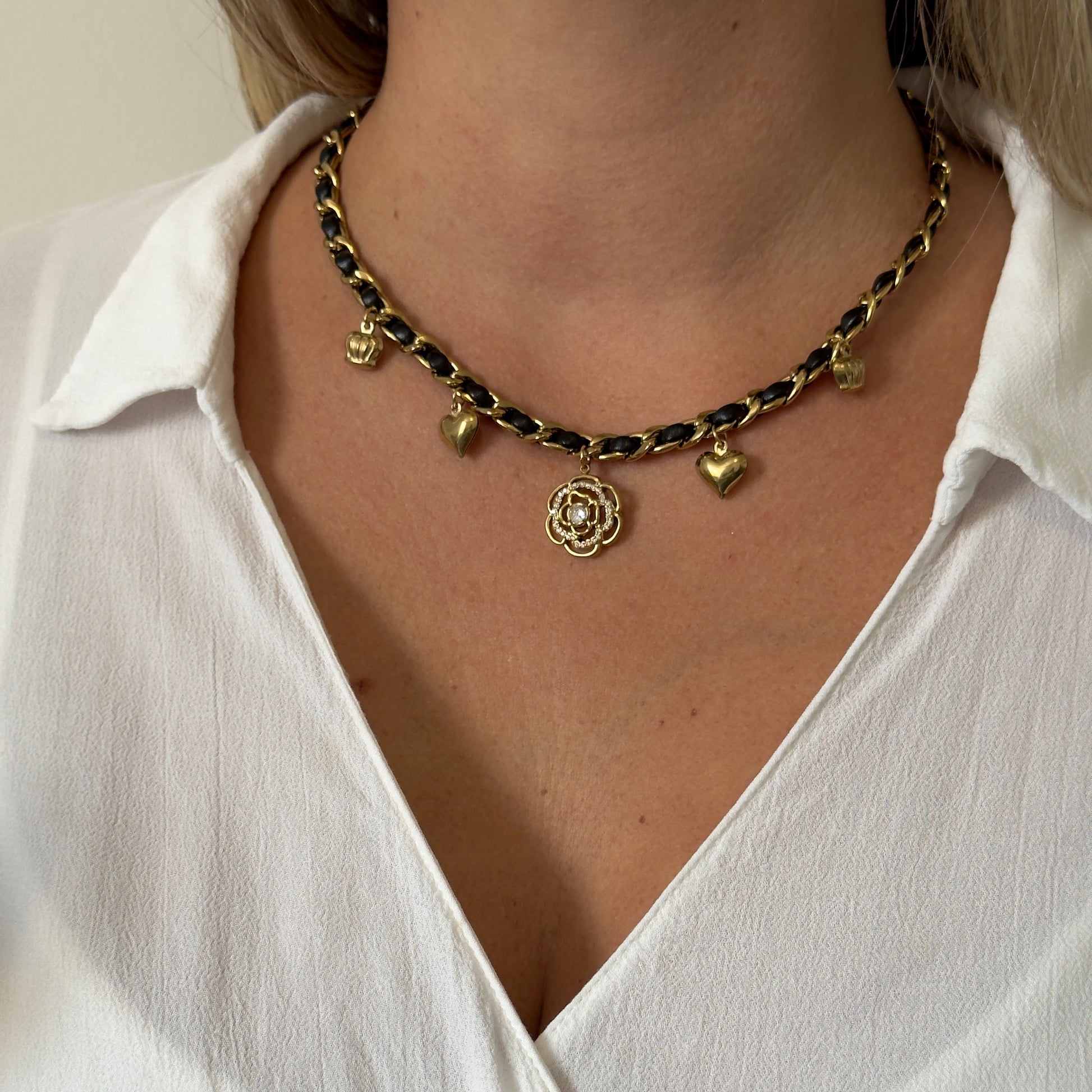 Ce collier ras de cou en acier inoxydable doré, agrémenté de cuir synthétique tressé, marie parfaitement élégance et personnalité. Il se distingue par ses pendentifs délicats en forme de rose ornée de strass et de cœur, tandis que sa chaînette de rallonge de 10 cm offre une adaptation optimale à votre style.