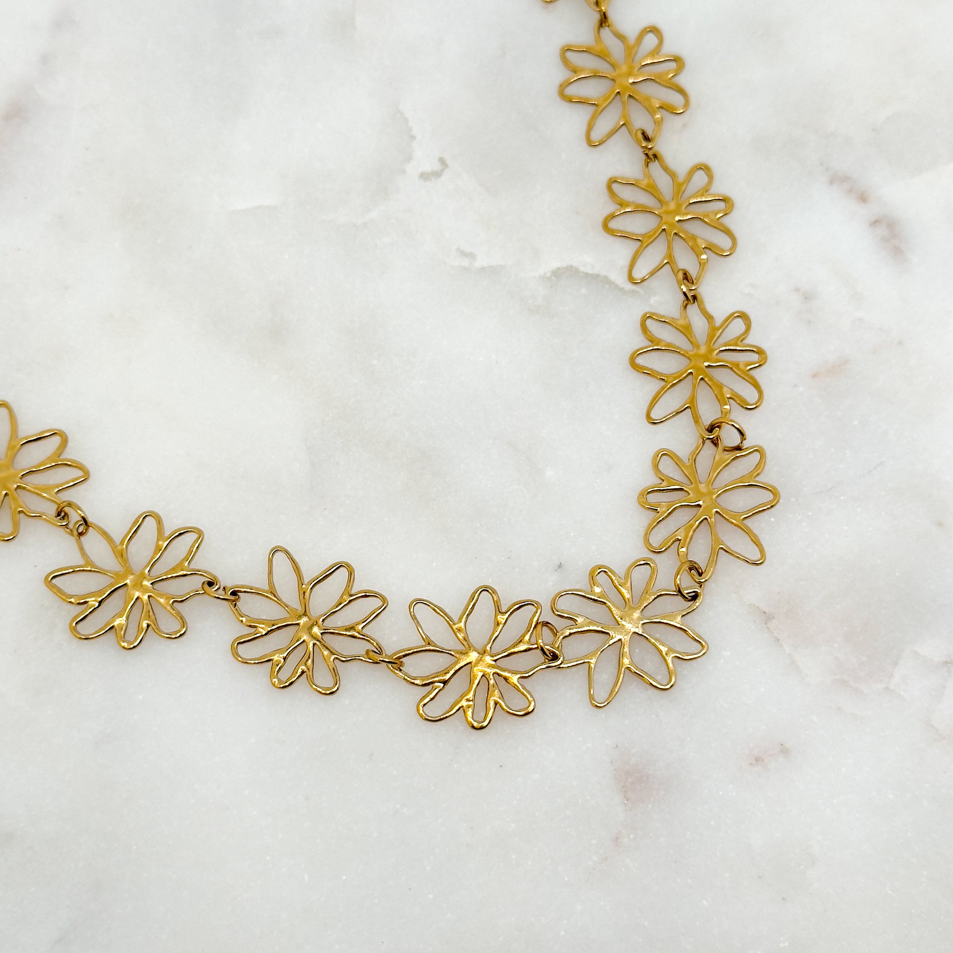 Le collier Daisy se distingue par ses maillons délicats en forme de fleurs ajourées. Raffiné et lumineux, il apporte une touche de fraîcheur et d’élégance naturelle à vos tenues, que ce soit pour le quotidien ou pour une occasion spéciale.