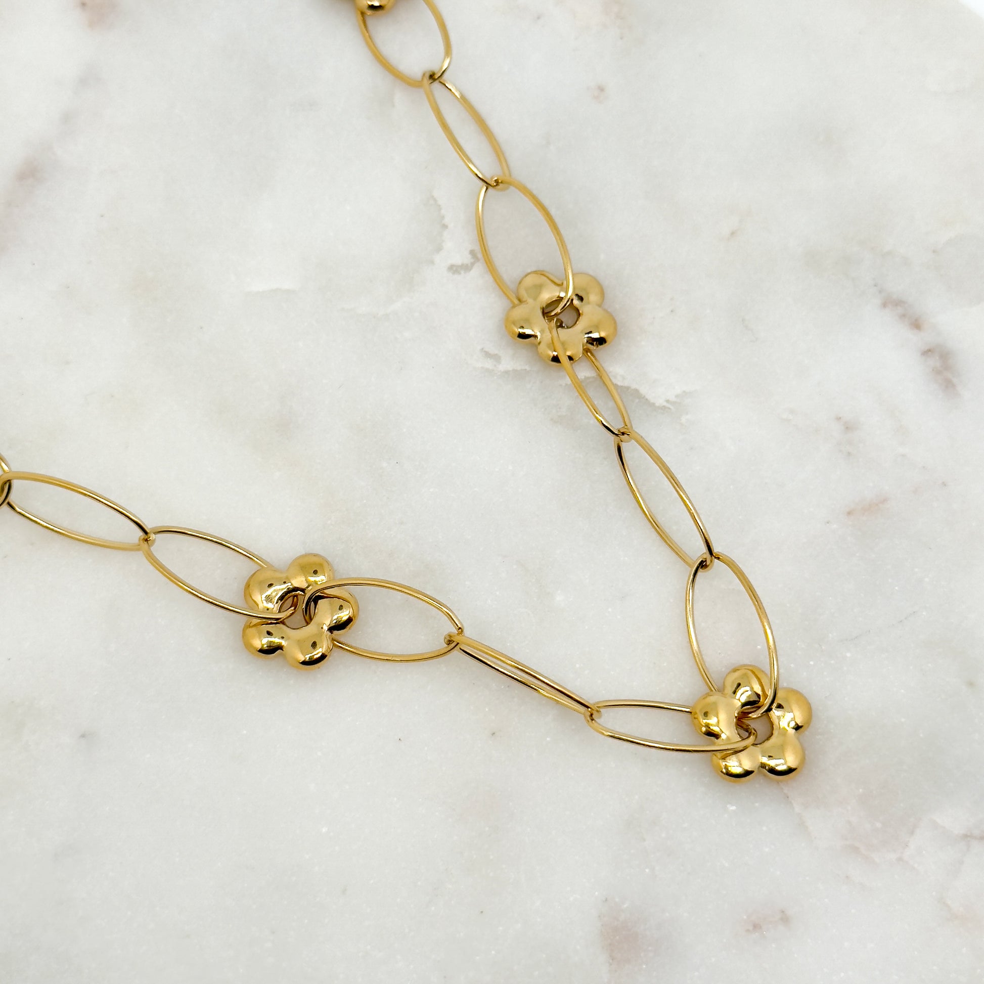 Un collier raffiné composé de maillons dorés et de fleurs en relief, pour une touche lumineuse et féminine.
