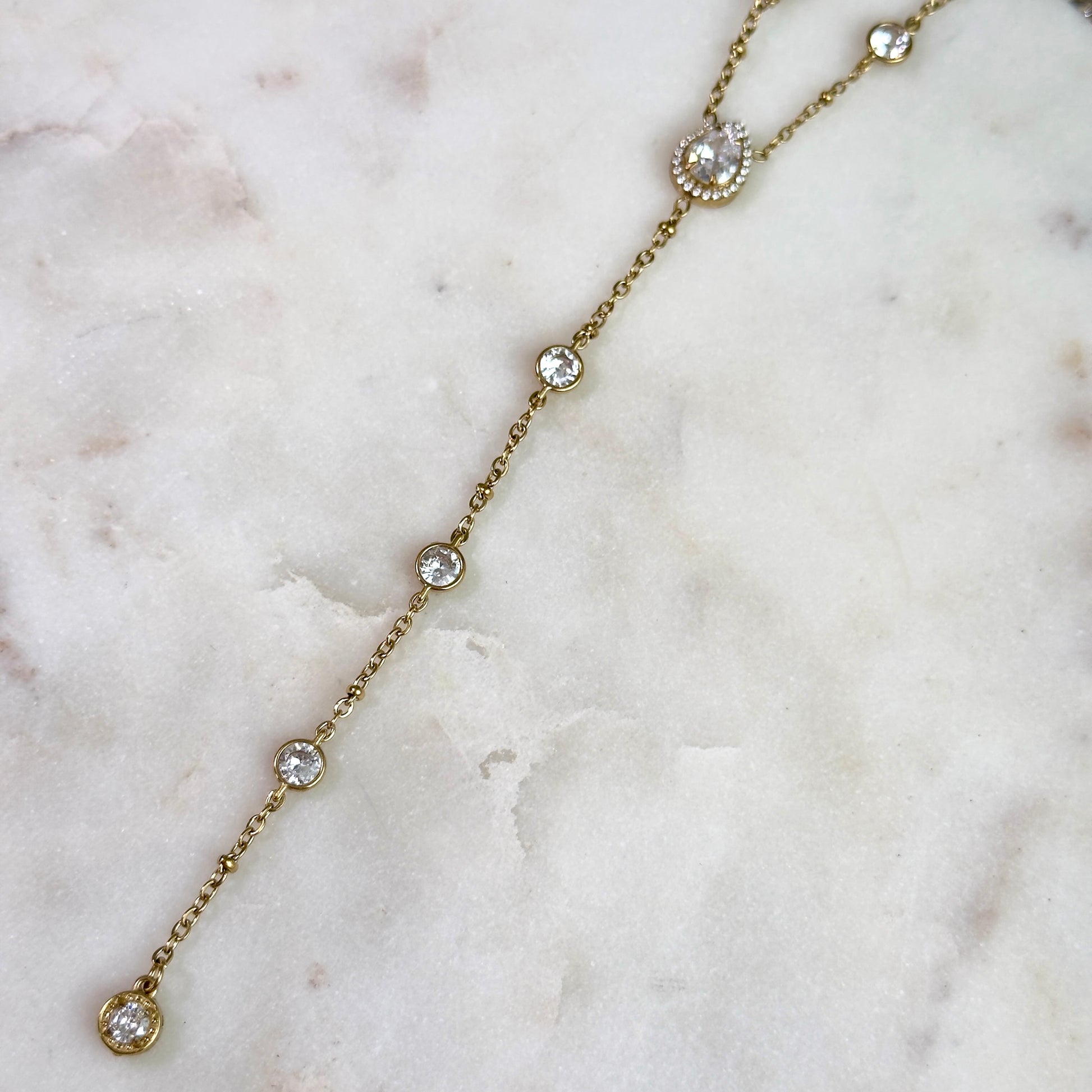 Collier doré en forme de Y, sublimé par un pendentif goutte serti de strass et une cascade de pierres scintillantes. Fin, lumineux et très féminin, il met en valeur le décolleté avec élégance. Conçu en acier inoxydable pour résister à l’eau et garder tout son éclat.