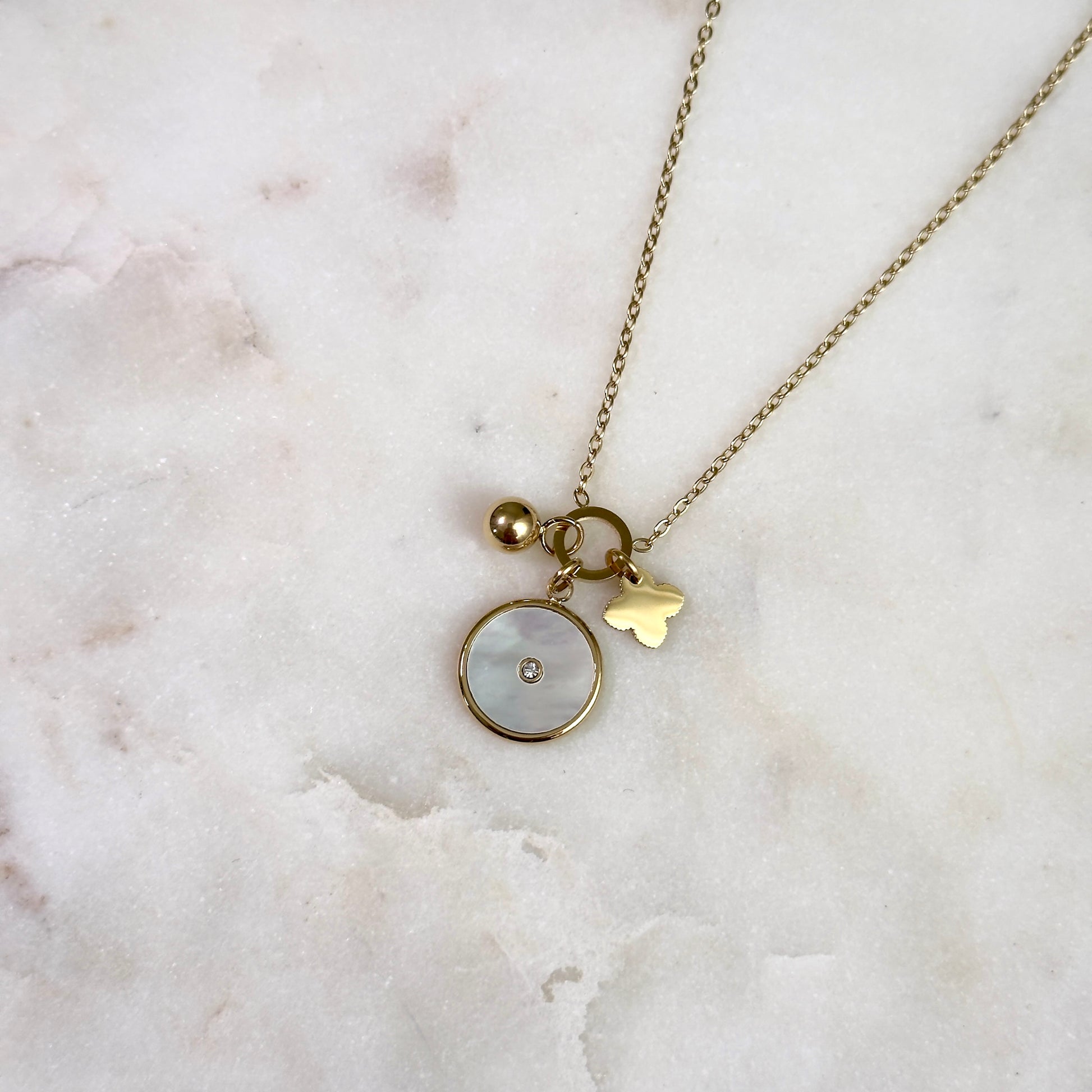 Le collier Noely incarne l’élégance douce et lumineuse. Son pendentif rond en nacre orné d’un strass central capte la lumière avec subtilité, tandis que le trèfle doré symbolise la chance et la féminité.