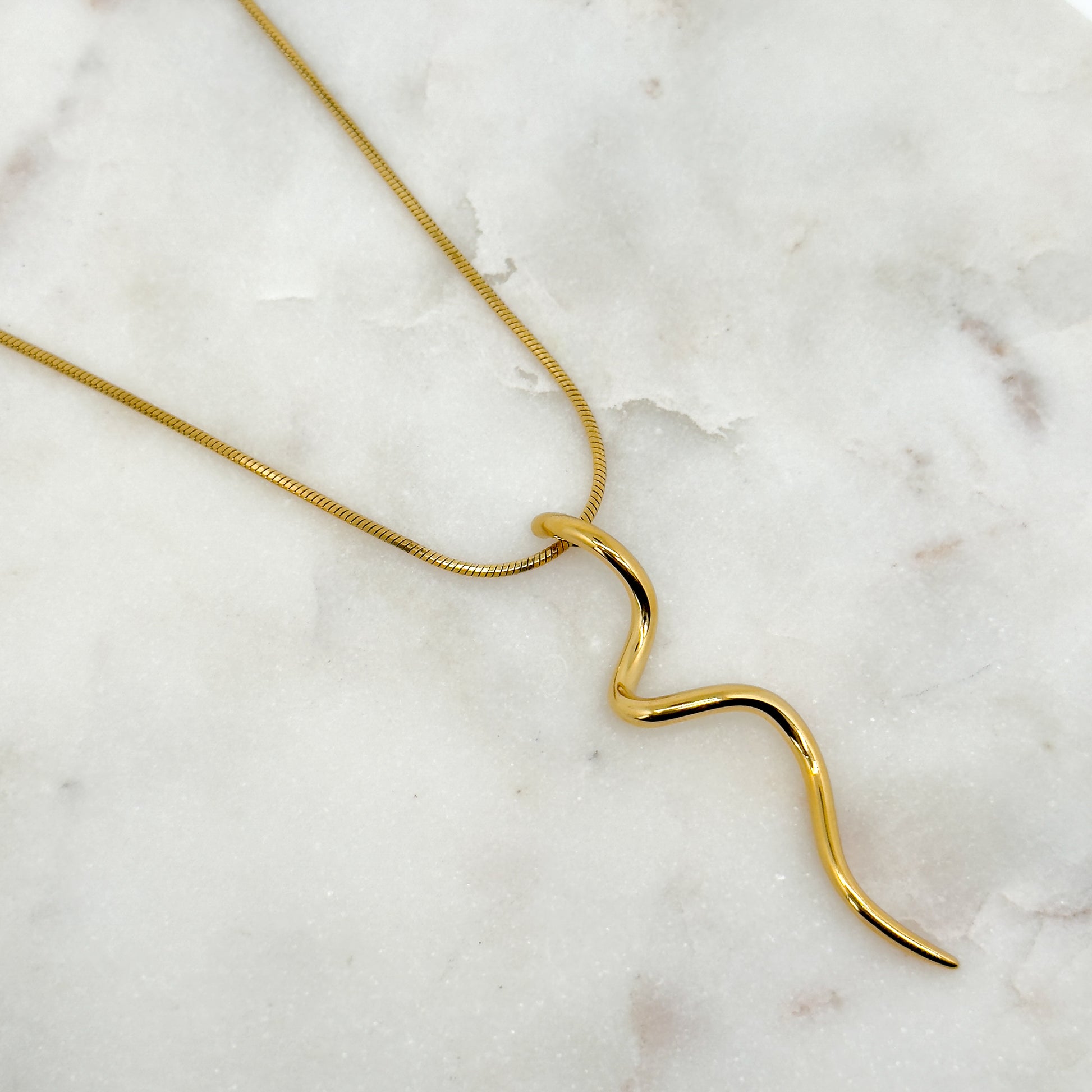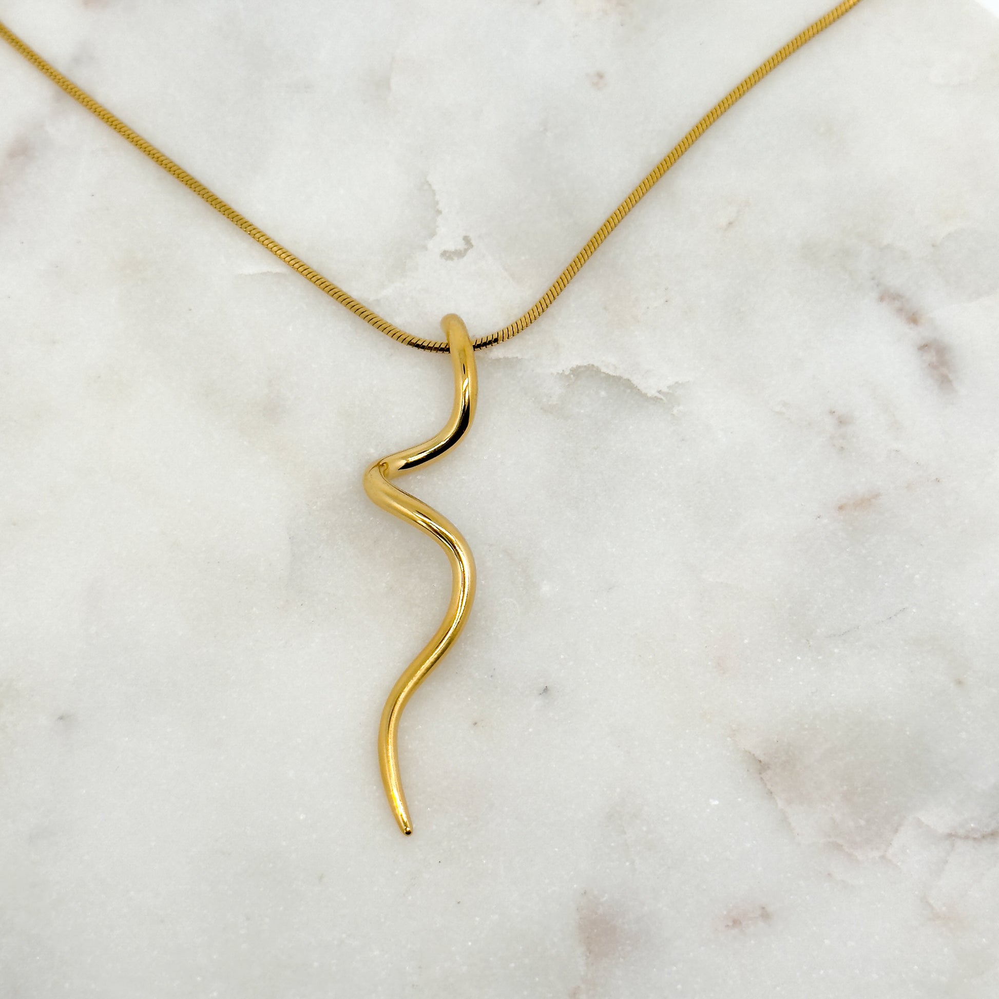 Un bijou moderne aux lignes fluides. Le collier Selma séduit par son pendentif doré en forme de vague stylisée, rappelant la souplesse de l’eau et l’élégance d’un serpent. Un modèle minimaliste qui apporte une touche d’originalité et de sophistication à toutes vos tenues.