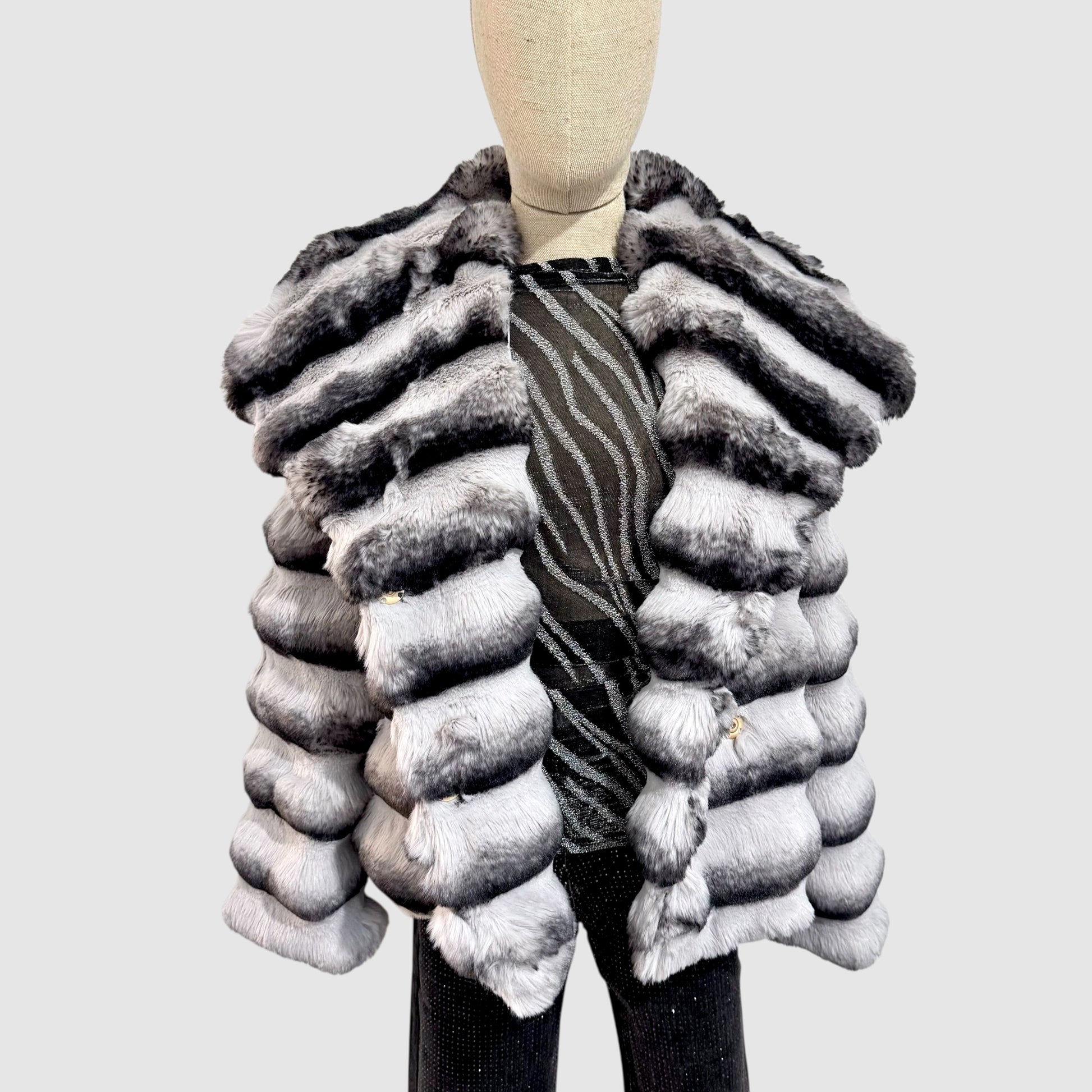 Cette veste en fausse fourrure s’impose comme une pièce forte de la saison.