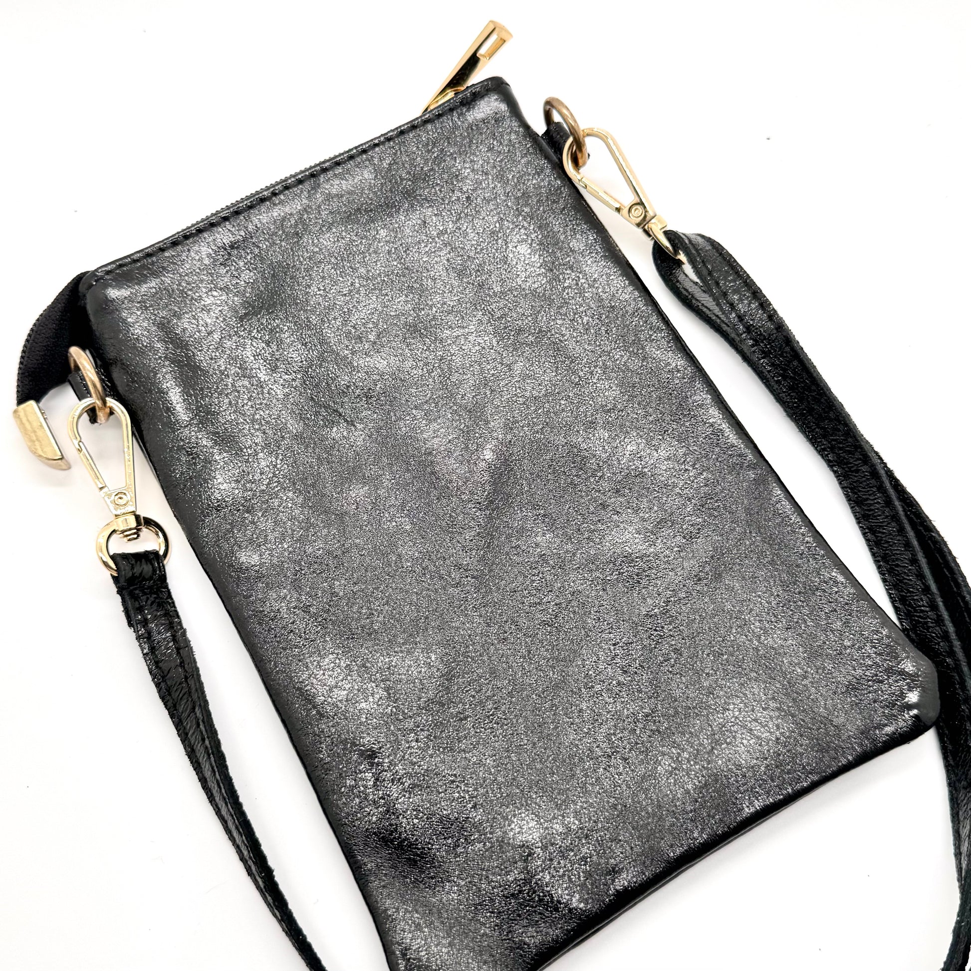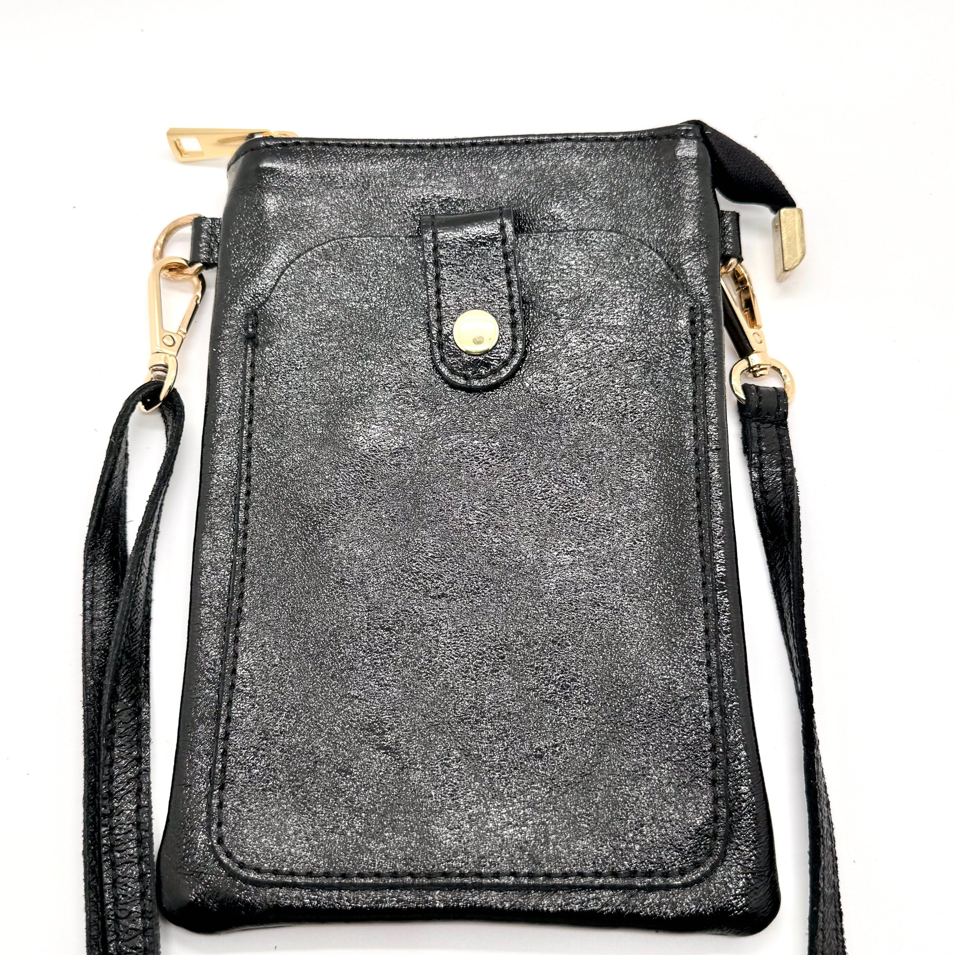 Pochette bandoulière téléphone en cuir véritable irisé noir