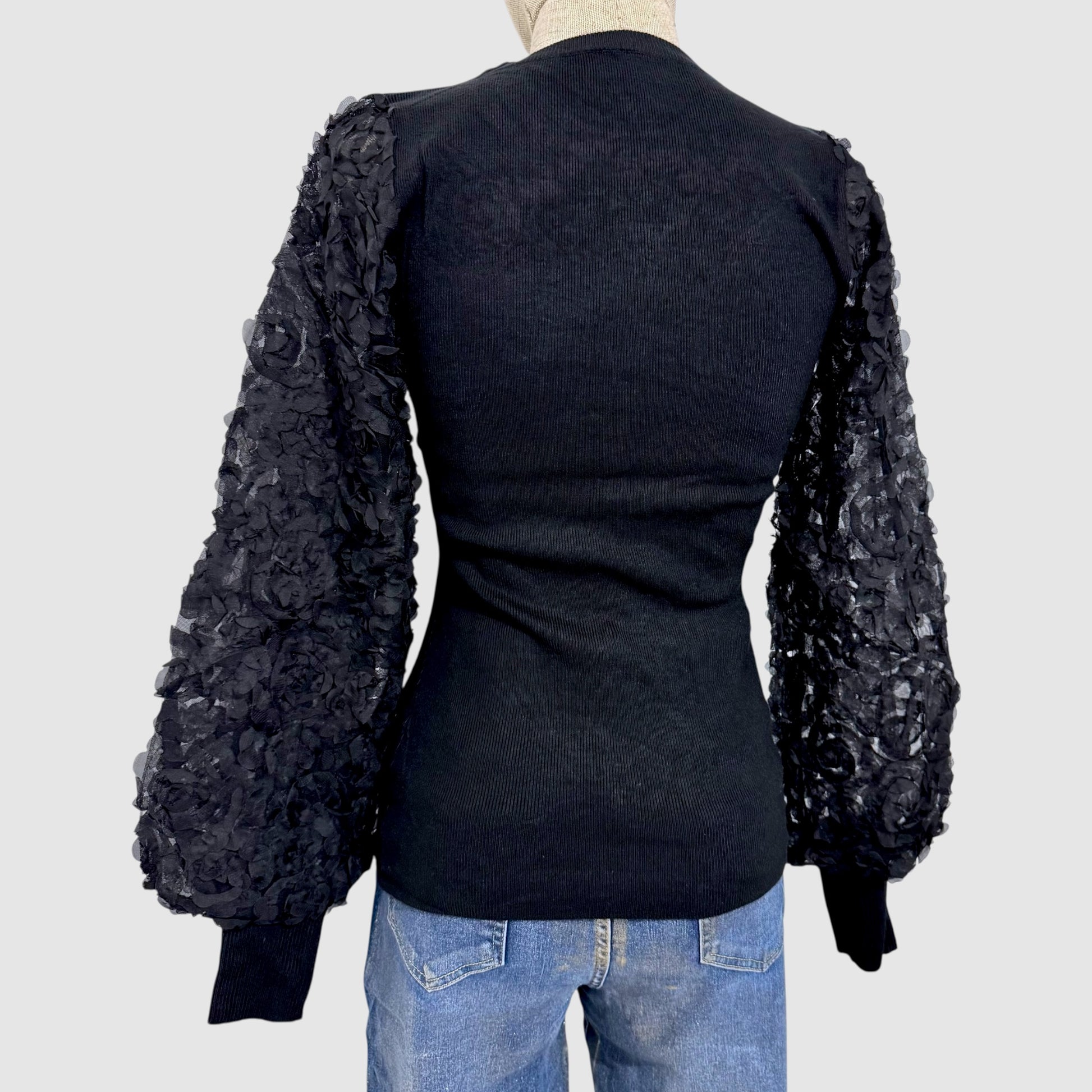 Pull fin et élégant, avec manches longues en voile à motif floral pour une touche féminine et raffinée. Coupe ajustée, agréable à porter au quotidien comme en soirée.