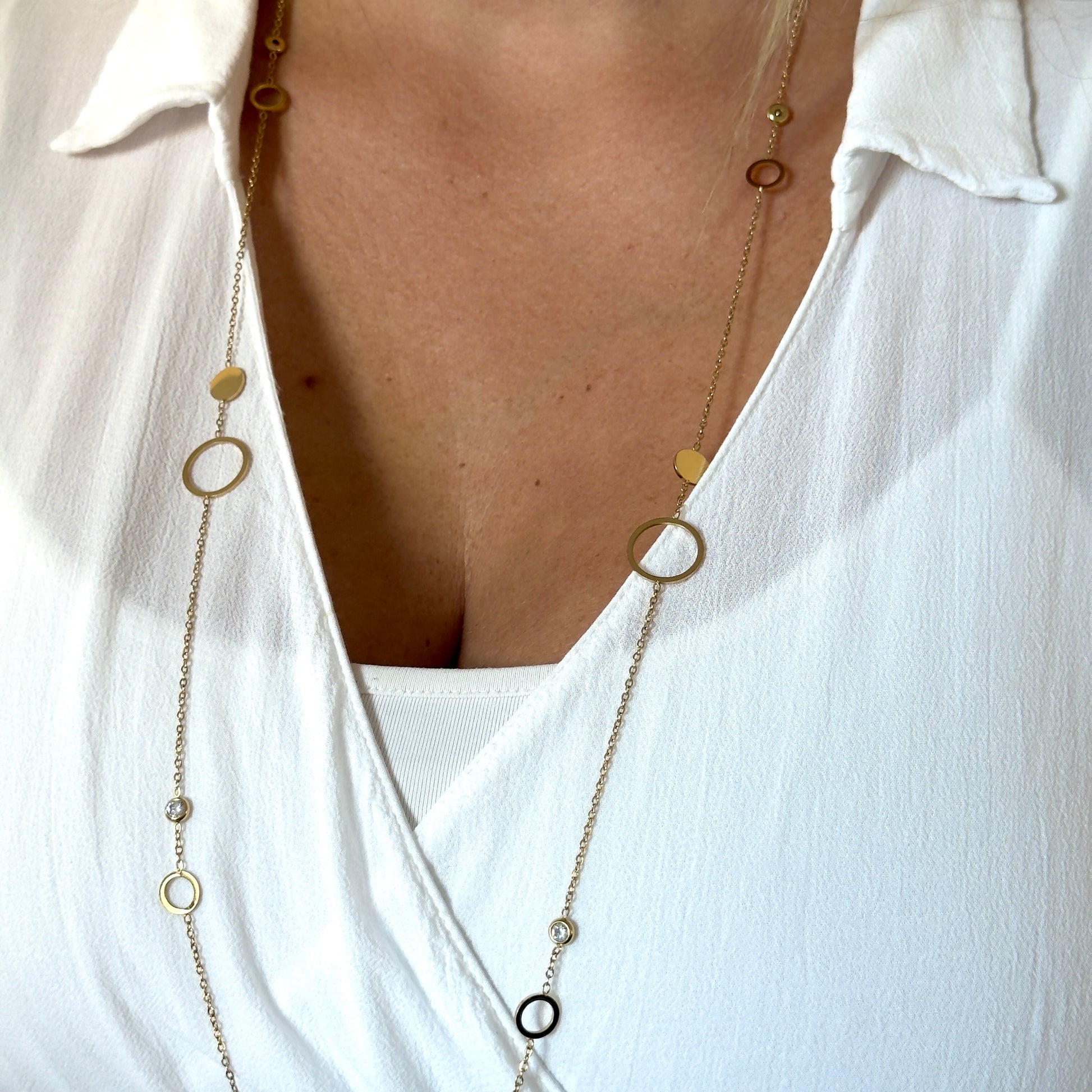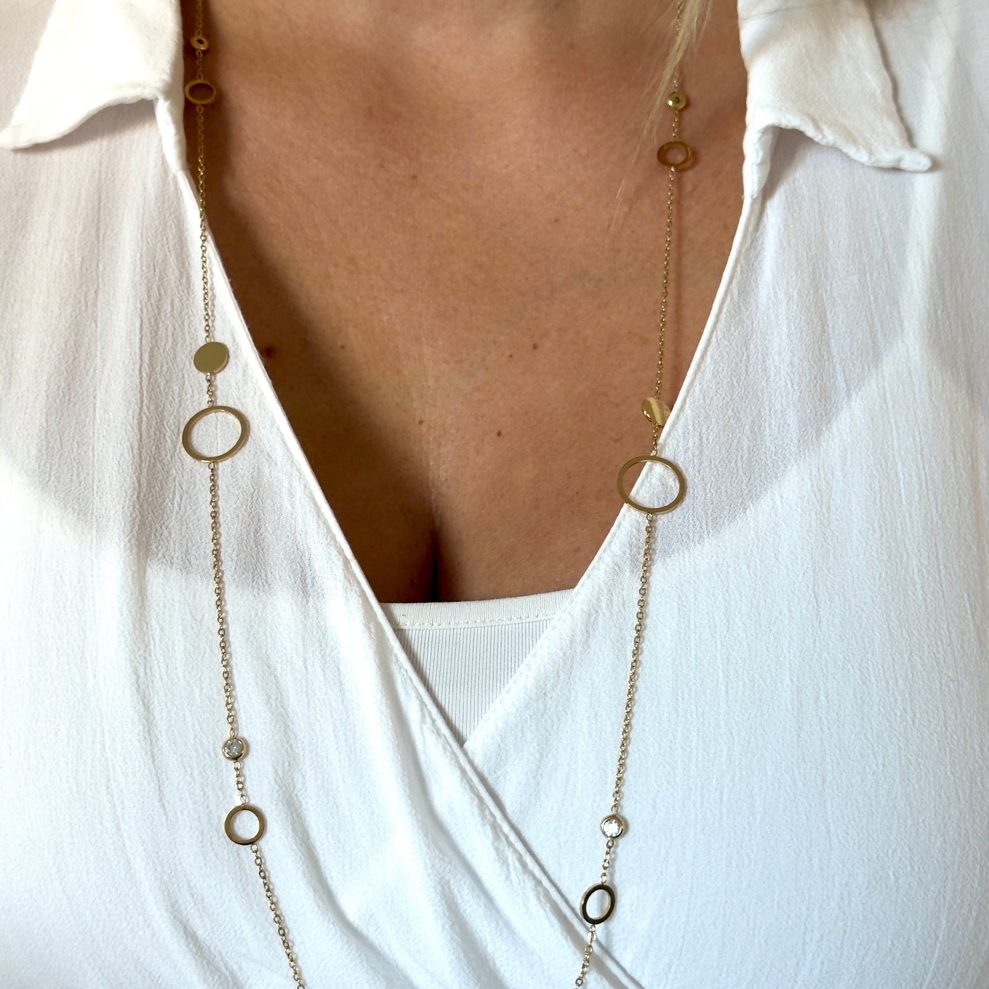 Sautoir doré en acier inoxydable orné de cercles et de strass. Élégant, lumineux et résistant à l’eau, il sublime le décolleté avec raffinement.