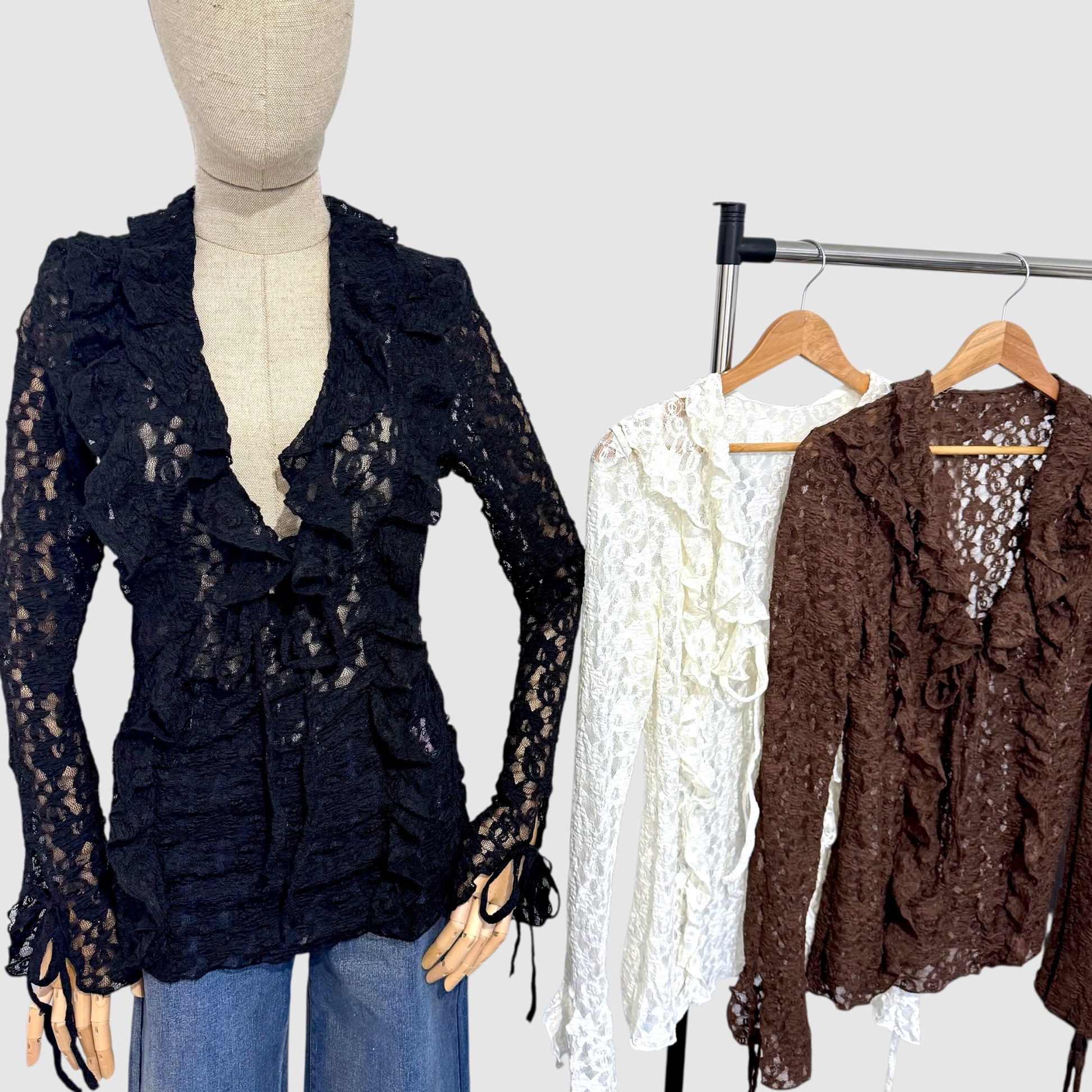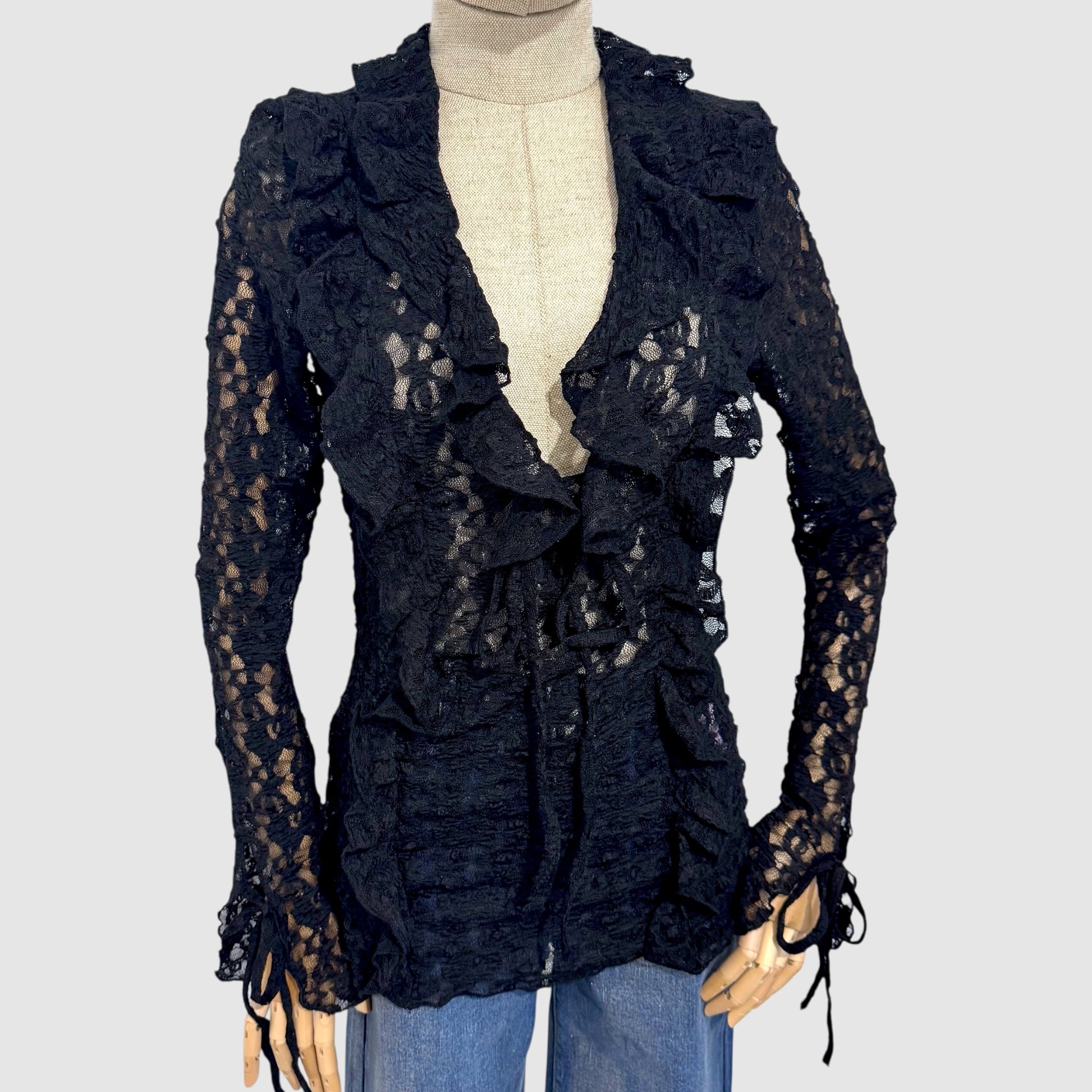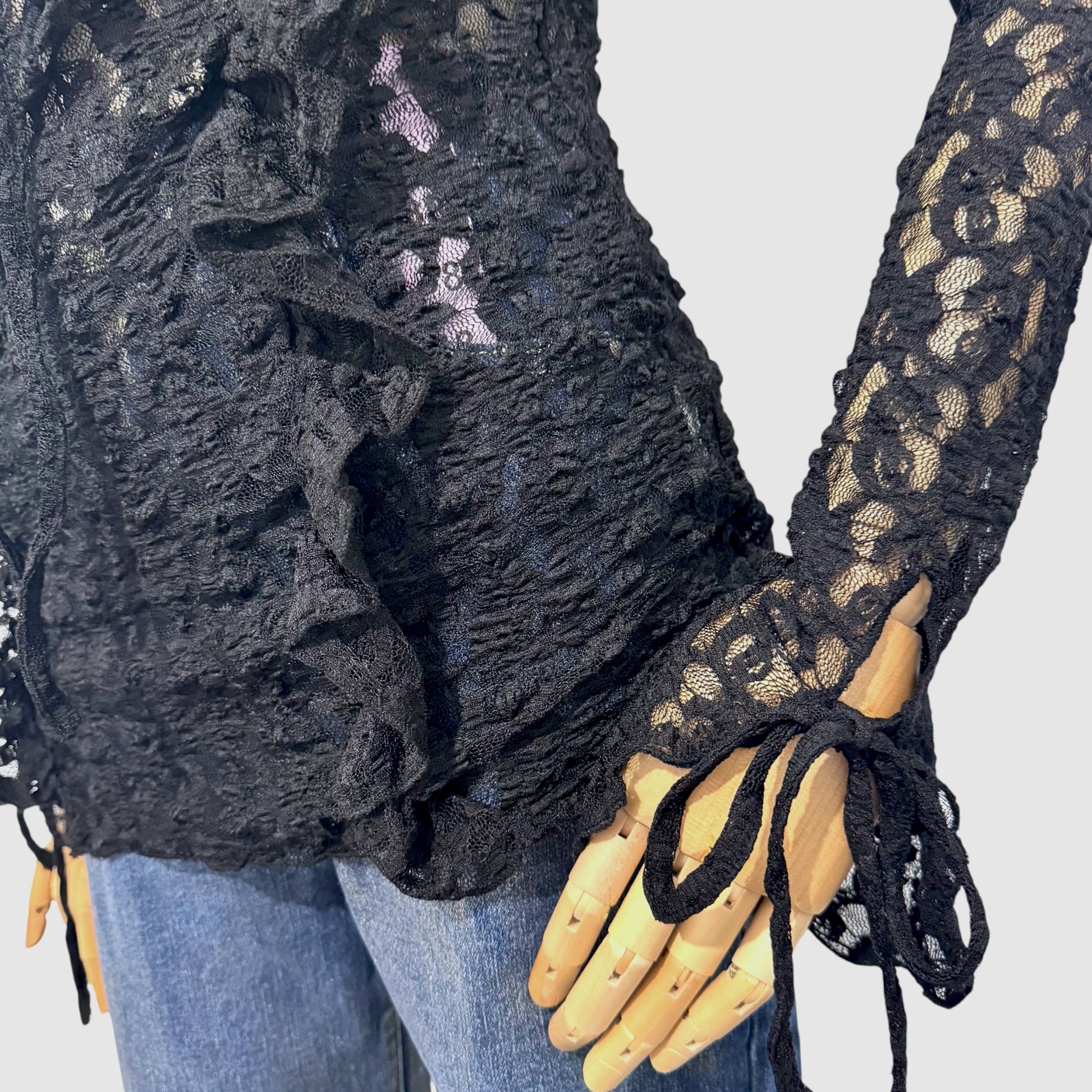Top en dentelle florale délicate, sublimé par des volants et un laçage ajustable à l’avant. Sa coupe près du corps et son jeu de transparence apportent une touche féminine et élégante, parfaite de jour comme de soirée.