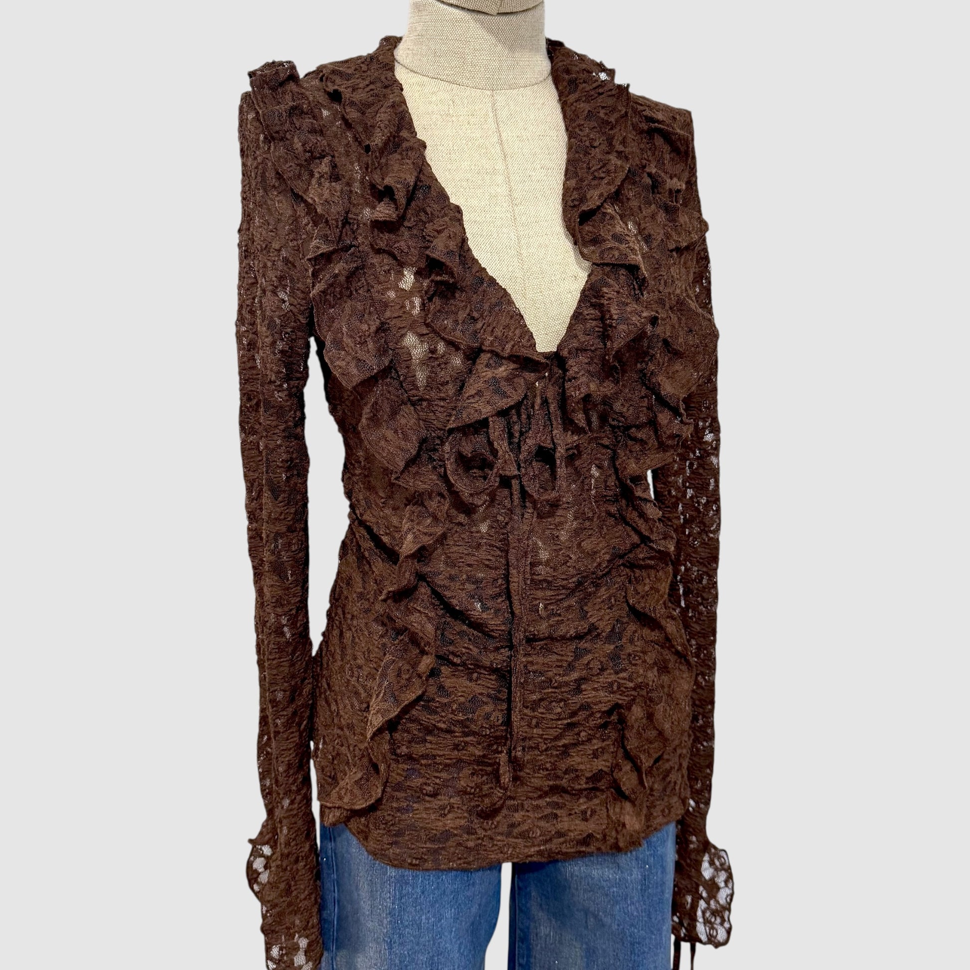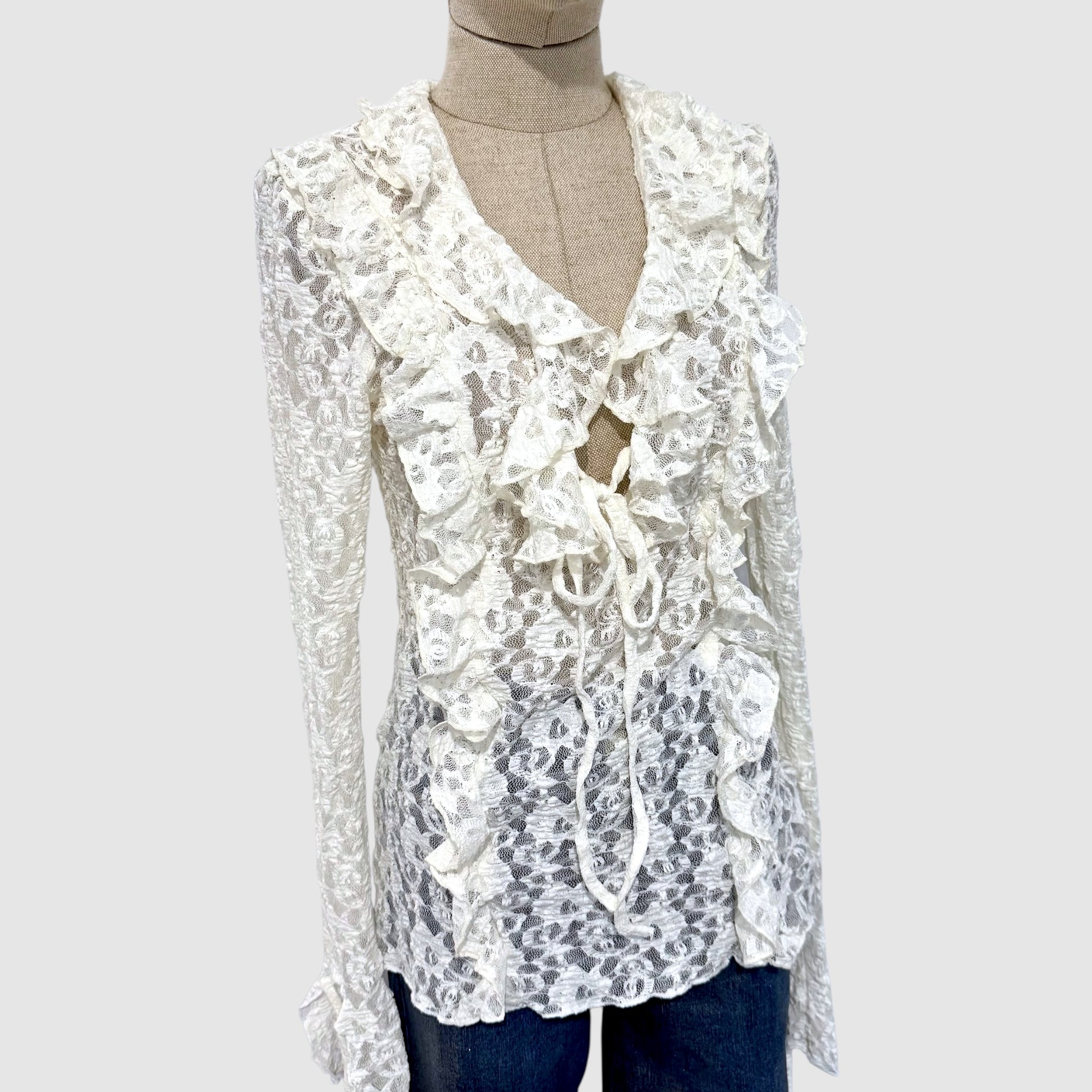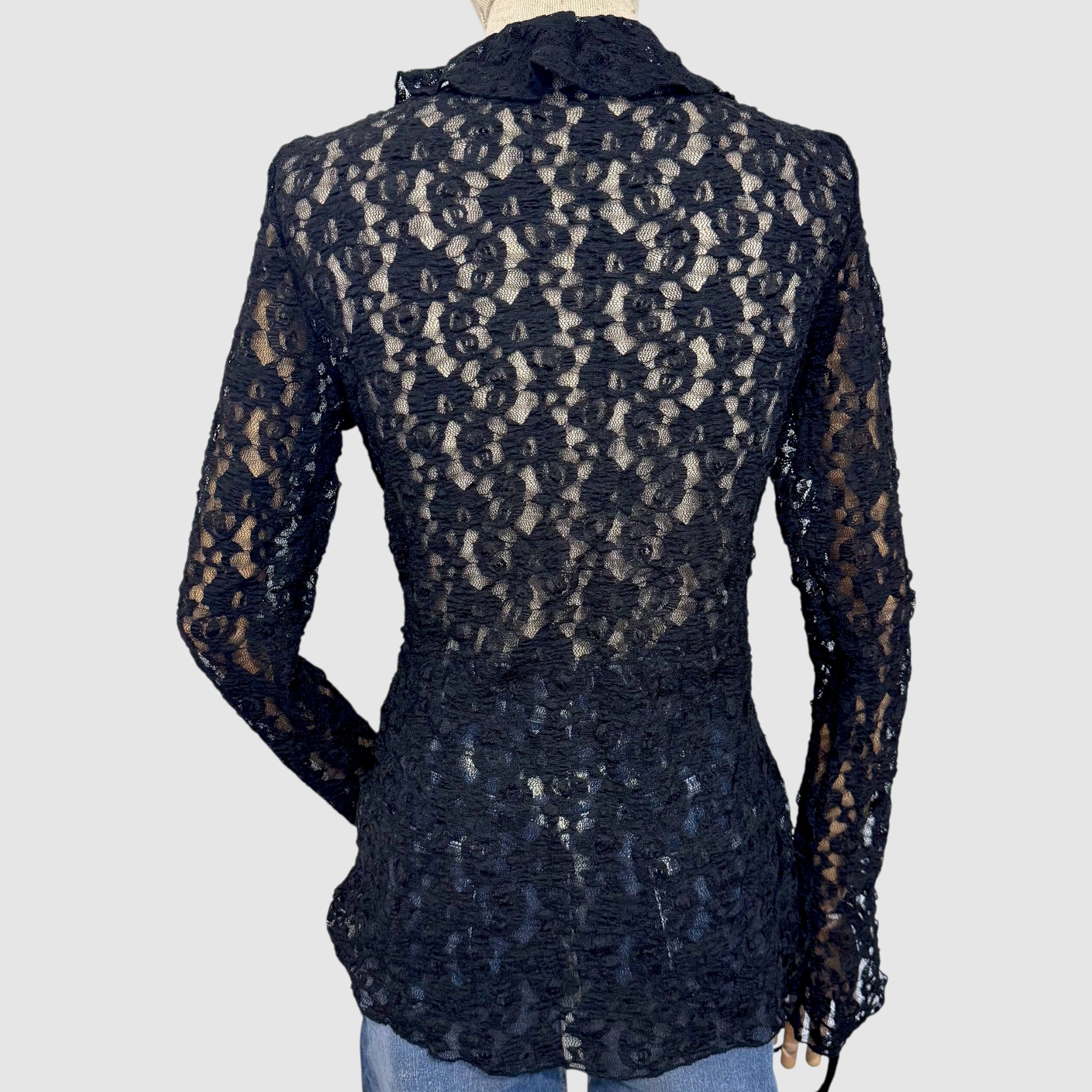 Top en dentelle florale délicate, sublimé par des volants et un laçage ajustable à l’avant. Sa coupe près du corps et son jeu de transparence apportent une touche féminine et élégante, parfaite de jour comme de soirée.