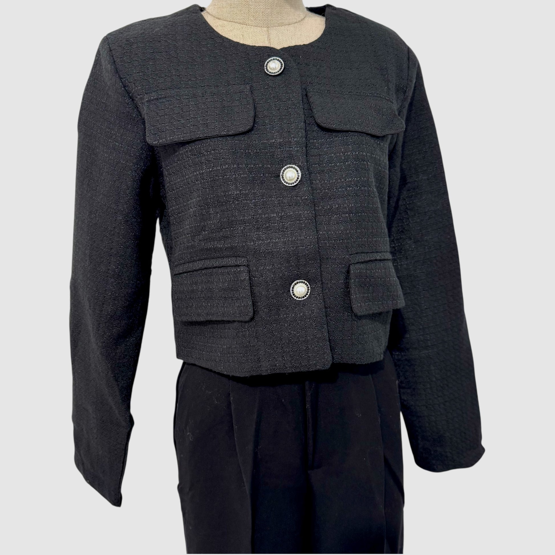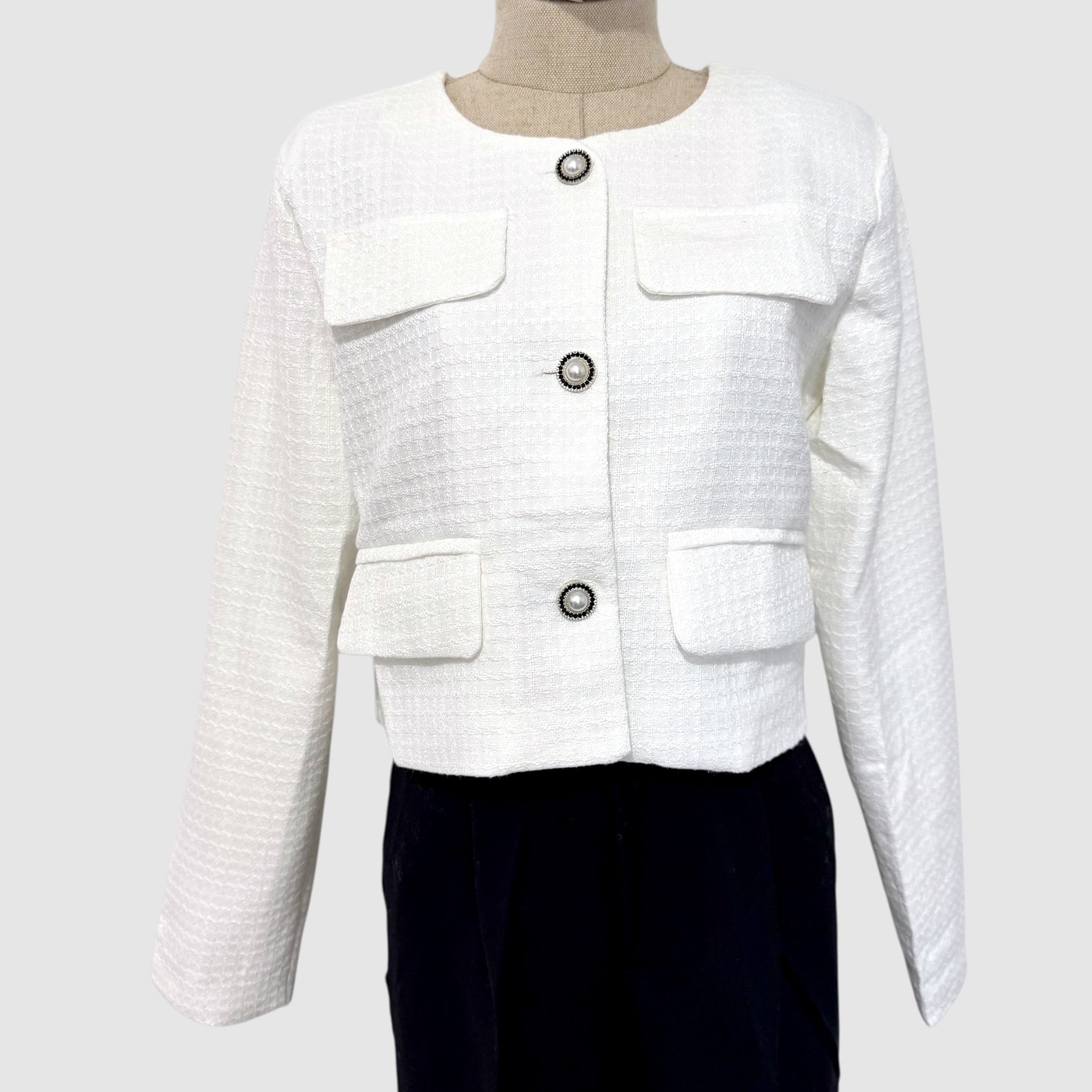 Veste courte à l’esprit couture, confectionnée dans un tissu texturé façon tweed. Coupe droite, col rond et boutons décoratifs pour une allure élégante et structurée. Idéale pour sublimer une tenue du quotidien ou un look habillé.